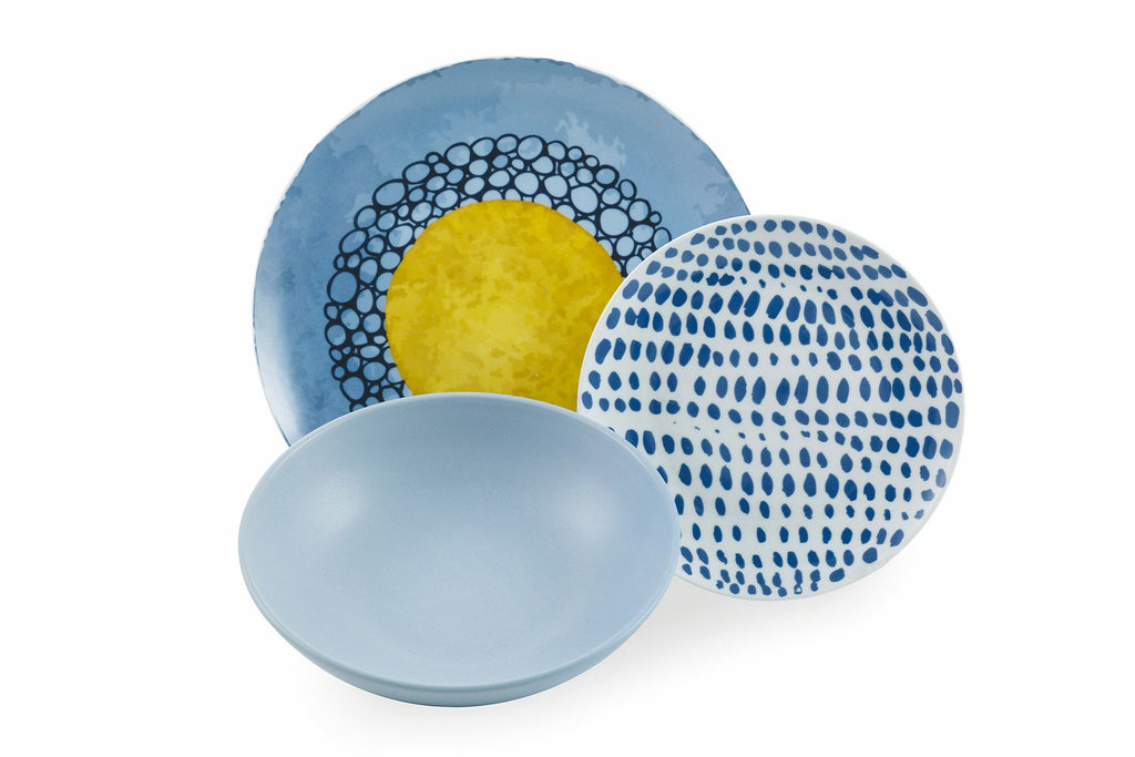 Porcelaine et grès : le mélange parfait entre fonctionnalité et raffinement. Élégance et légèreté distinguent les assiettes plates et les assiettes à fruits, réalisées en porcelaine blanche très fine sur laquelle est appliqué le décalque. Le grès émaillé des six assiettes creuses apporte cependant de la fonctionnalité à la table : épais et résistant, il maintient la chaleur des entrées chaudes comme les soupes et les bouillons et facilite leur service. La surface émaillée rehausse les couleurs de la table. Parmi les fonds marins tropicaux, là où la mer cesse d'être simplement la mer, les fonds marins deviennent une œuvre d'art contemporaine en constante évolution. Les poissons colorés se mélangent aux coraux, effleurent les rochers et traversent des algues épaisses et vibrantes qui sculptent une installation véritablement abstraite. Dans l'immensité de la barrière de corail nous nous sommes arrêtés avec le service Marea, qui vit aux couleurs des fonds marins et reproduit avec la liberté et la délicatesse une vague de décors improvisés et uniques dans chaque plat.