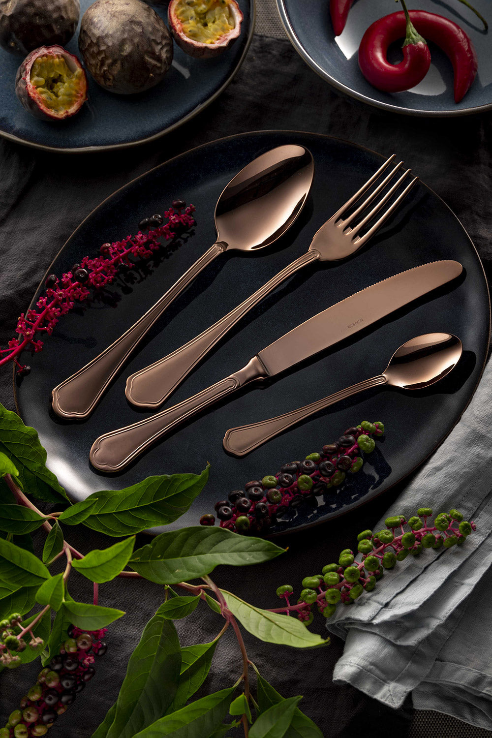 Domus Chocolate est une collection de couverts en acier inoxydable 18/10 poli miroir avec finition PVD chocolat.