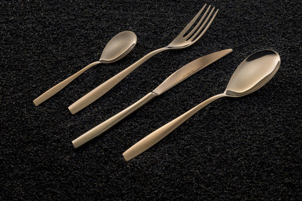 Eleven Rosé est une collection de couverts en acier inoxydable 18/10 poli miroir avec une finition PVD brunie raffinée et raffinée.