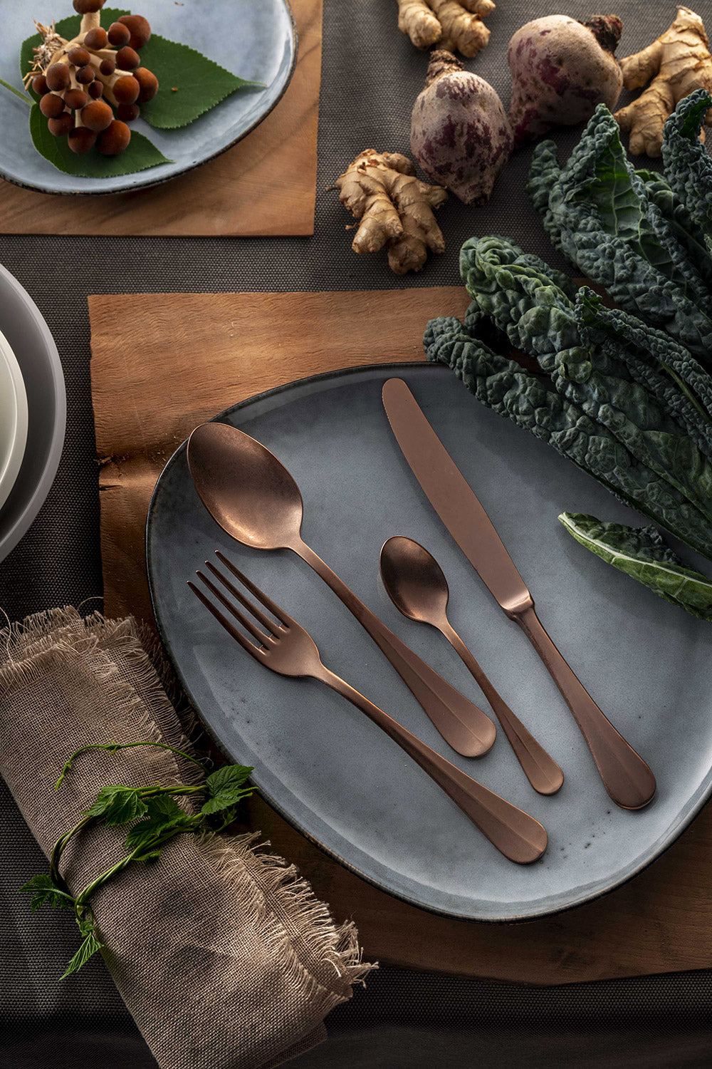 Royal Retrò Chocolate est une collection de couverts en acier inoxydable 18/10 avec une combinaison raffinée de finition rétro et de PVD chocolat.