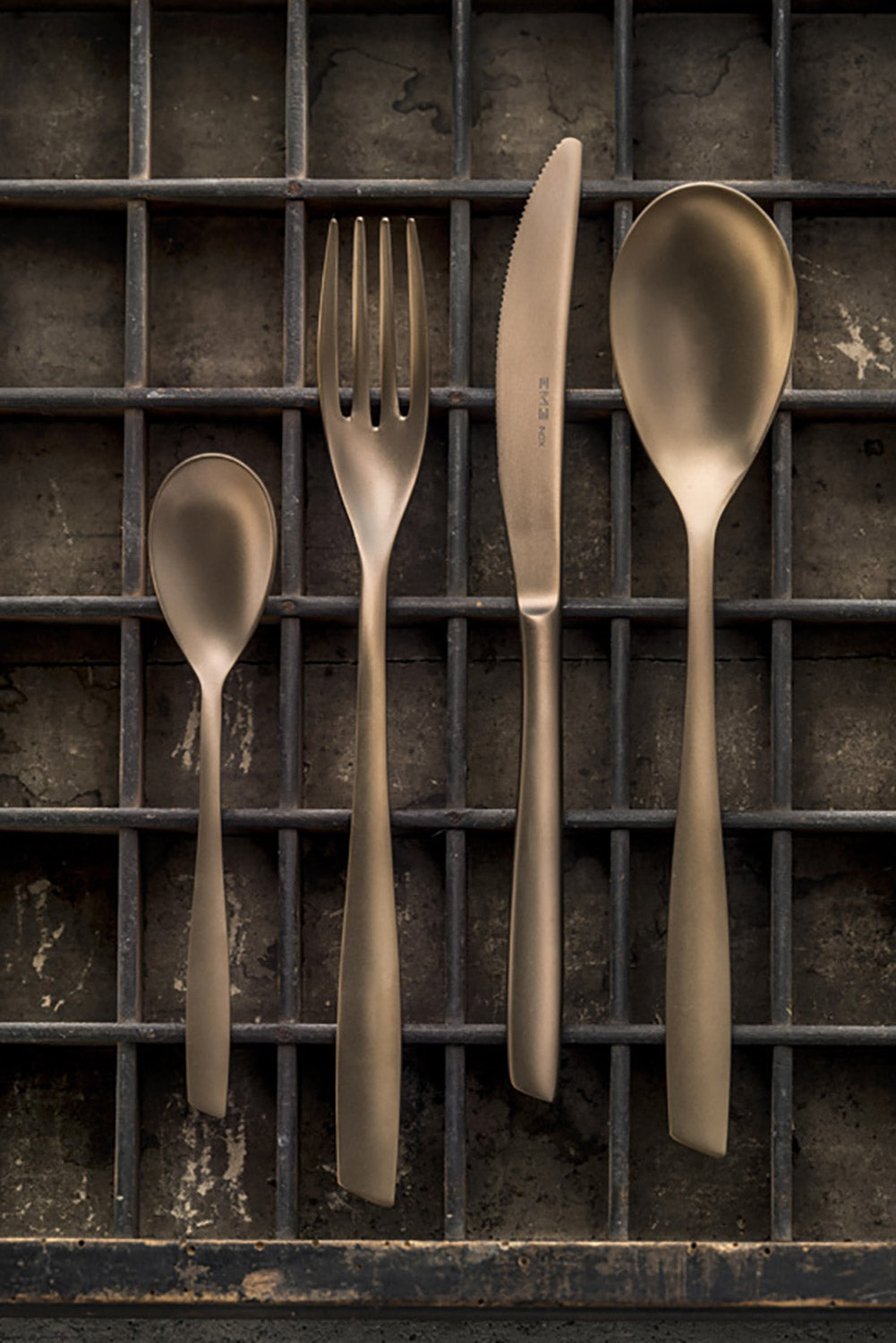 Eleven Sahara est une collection de couverts en acier inoxydable 18/10 avec une finition sablée et brunie réalisée avec un traitement PVD qui la rend particulièrement exclusive et élégante.