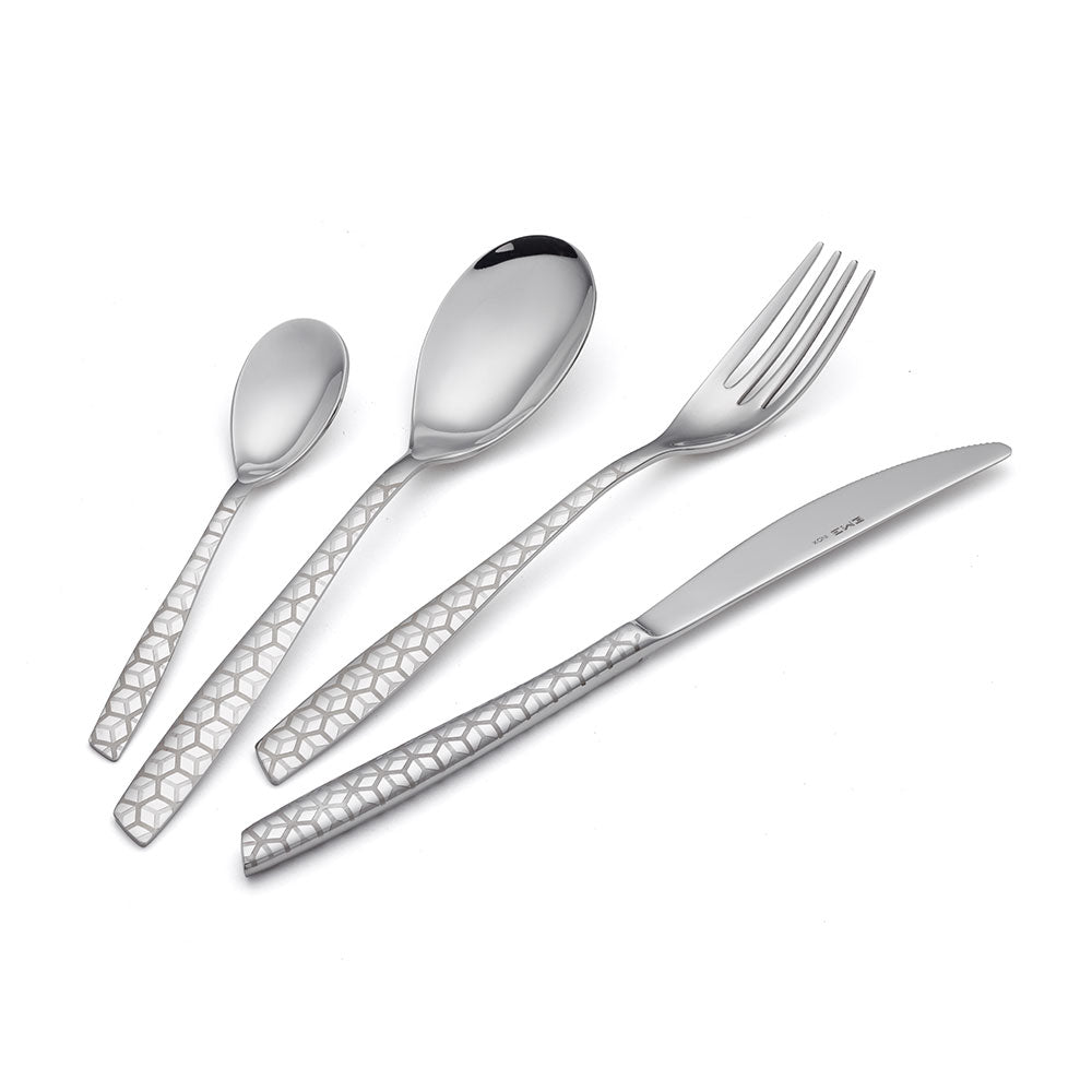 Ensemble de 24 pièces pour 6 personnes . Eleven Exa Série de couverts adaptés aux environnements jeunes qui exigent de l'originalité sur leur table non seulement lors d'occasions spéciales mais aussi dans la vie de tous les jours. Il se distingue par le design sophistiqué créé avec un laser bicolore de haute technologie qui crée un effet tridimensionnel. Il arbore des lignes au design contemporain et tendance, reconnaissable notamment à la douce rondeur des cuillères. Le manche est rendu agréable par les lignes harmonieuses et la coupe oblique au bout des anses qui distingue cette série. Ligne de couverts en acier 18/10.