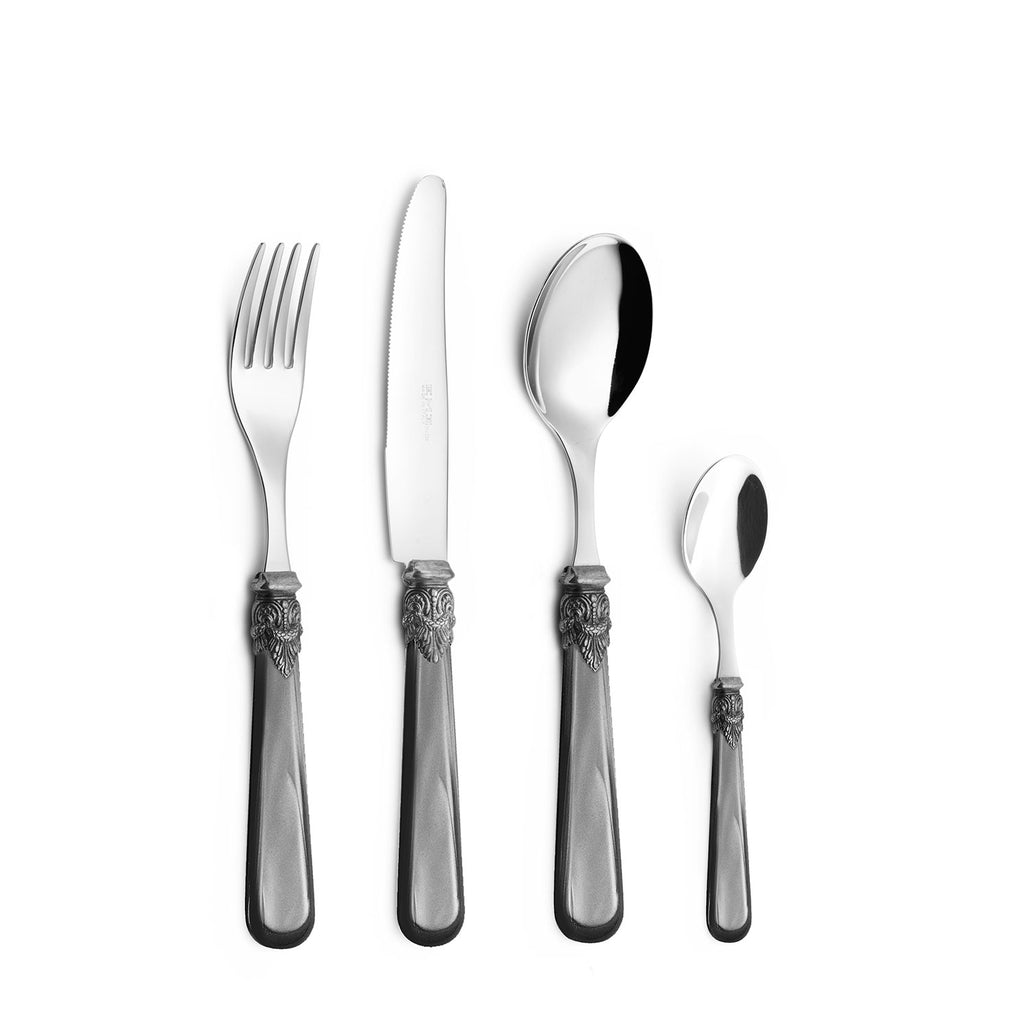 Set 24 pezzi per 6 persone. Napoleon linea di posate con ghiere brunite dai tipici intagli del periodo barocco e manici arrotondati sulla parte terminale. Il modello di questa posata è indicato ad arredare una tavola romantica e la vasta gamma colori si presta a creare personali abbinamenti.