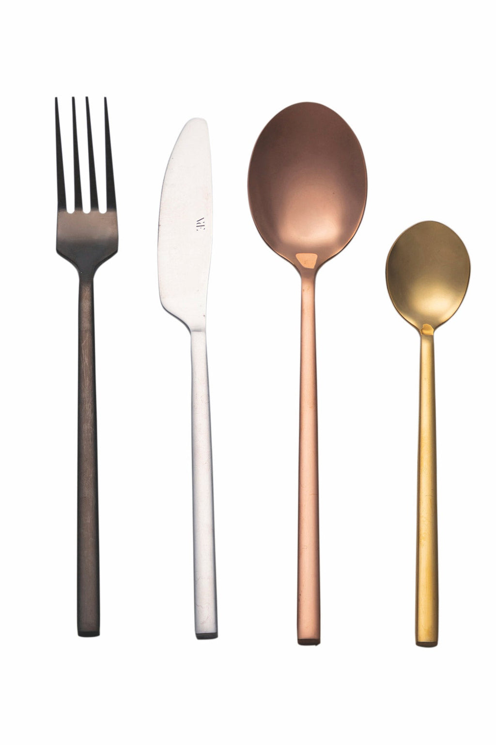- Le set se compose de : 6 fourchettes, 6 couteaux, 6 cuillères et 6 cuillères à café