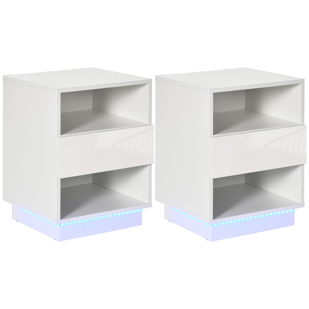 Set 2 Comodini con LED 40x40x55 cm 2 Ripiani 1 Cassetto in Truciolato Bianco