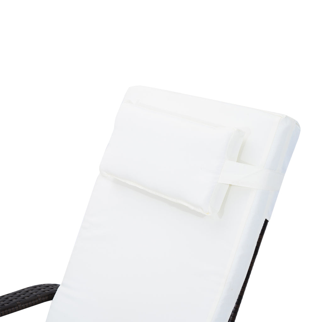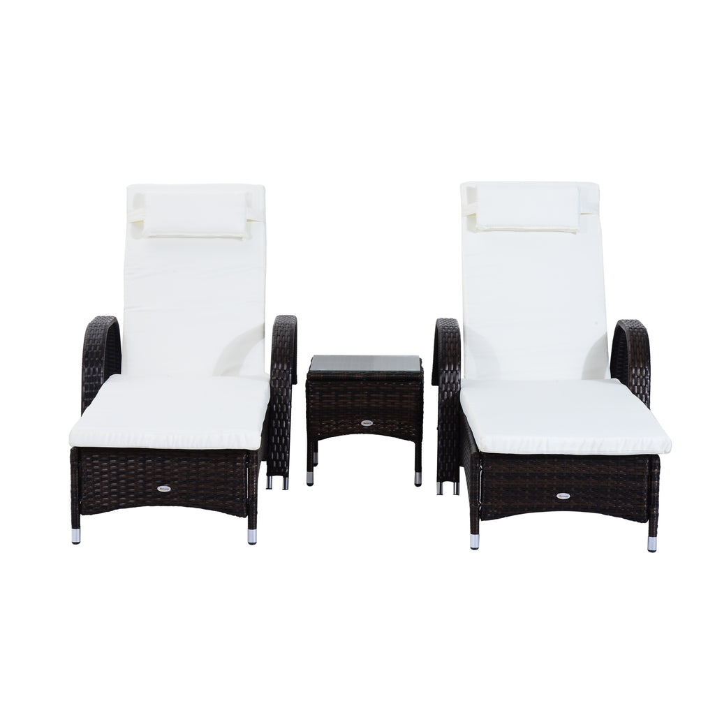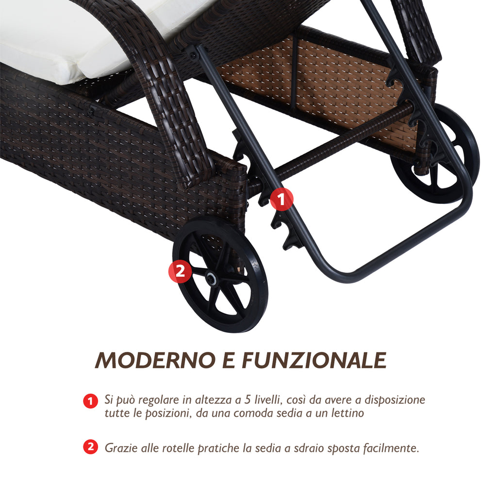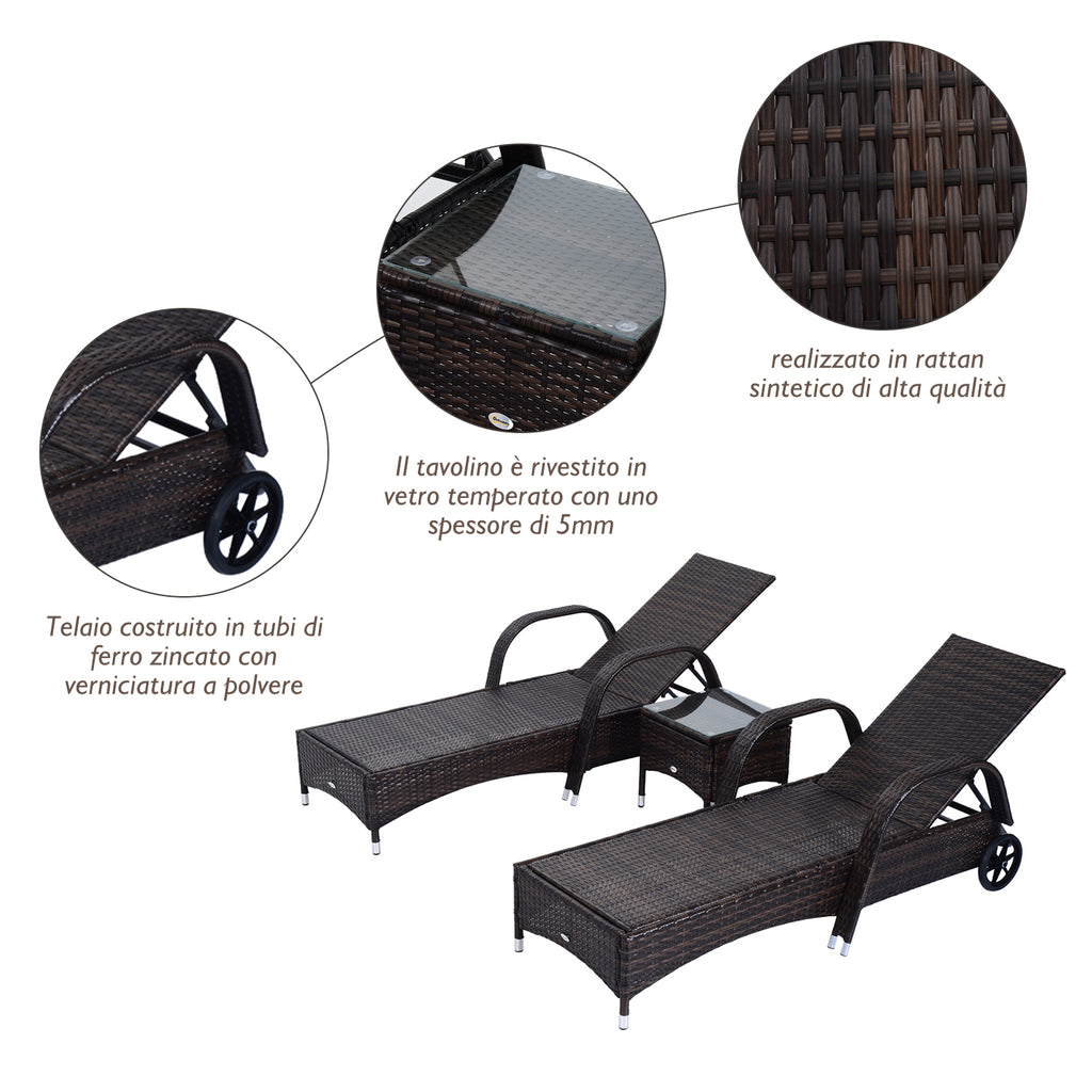 Lot de 2 bains de soleil de jardin en rotin capitonné inclinable avec roulettes et table basse marron