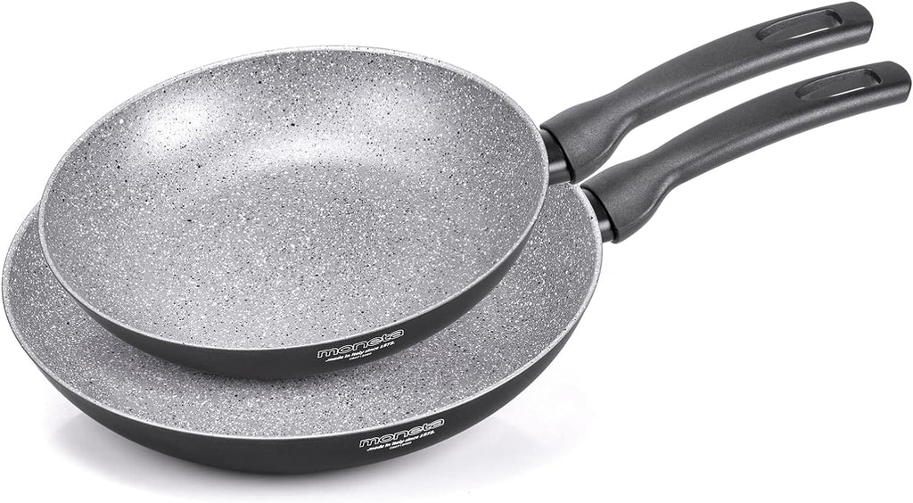 Set 2 Padelle Monta Insieme con corpo in alluminio forgiato ad alto spessore per una cottura rapida e uniforme. Rivestimento antiaderente effetto pietra Artech Stone Ultra, privo di PFOA, Nichel e Bisfenolo A. Dotati di Manici anti scottatura, idelali per ogni piano cottura, incluso l’induzione. Prodotto 100% Made in Italy.