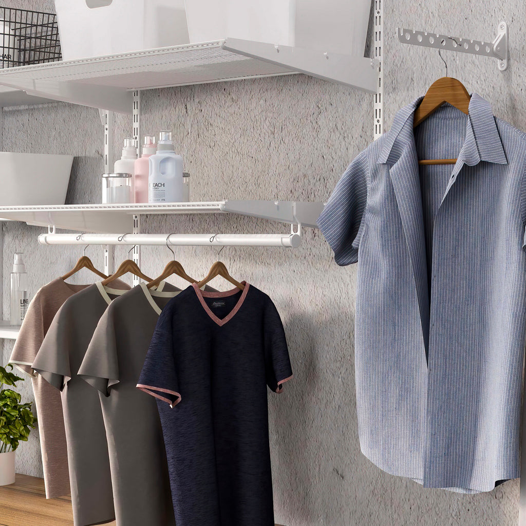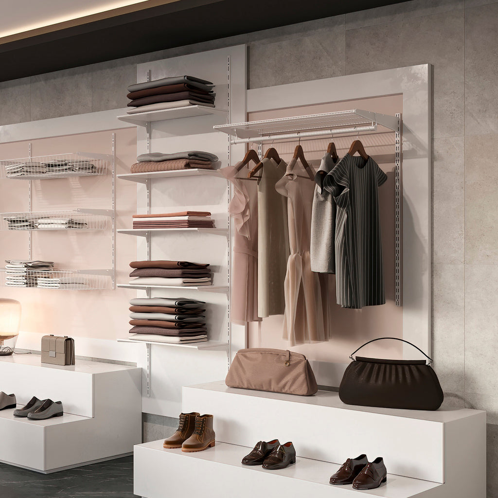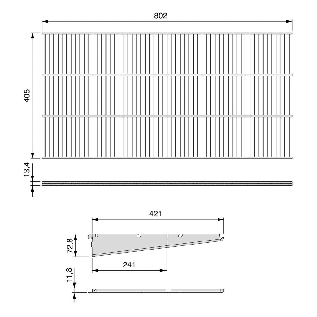 Kit d'accessoires pour la réalisation d'étagères avec étagères grillagées. Ils sont idéaux pour équiper l'intérieur des armoires, vestiaires, buanderies ou garde-manger.Ils sont conçus pour être utilisés en combinaison avec les profils de rack à double fente Jagmet au pas de 32 mm. Ce kit se compose de deux étagères et de deux jeux de supports (droit et gauche) pour l'installation. Ces supports ont des fentes pour placer la tringle du placard.