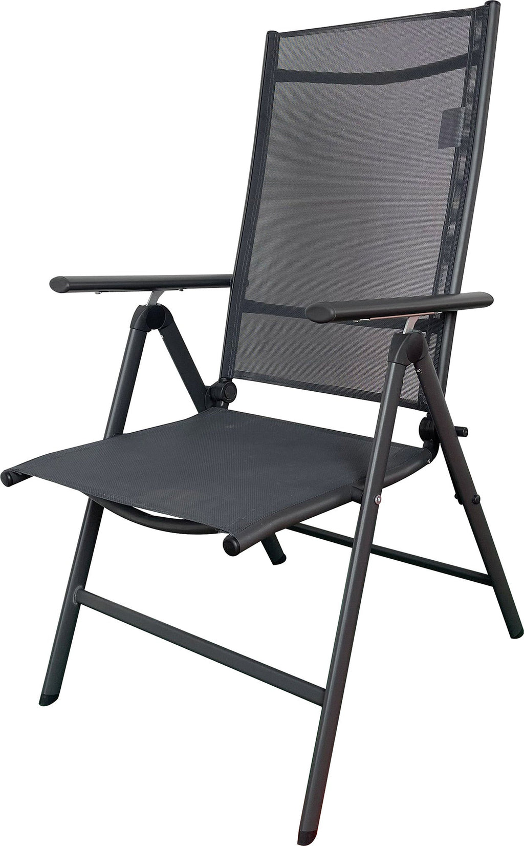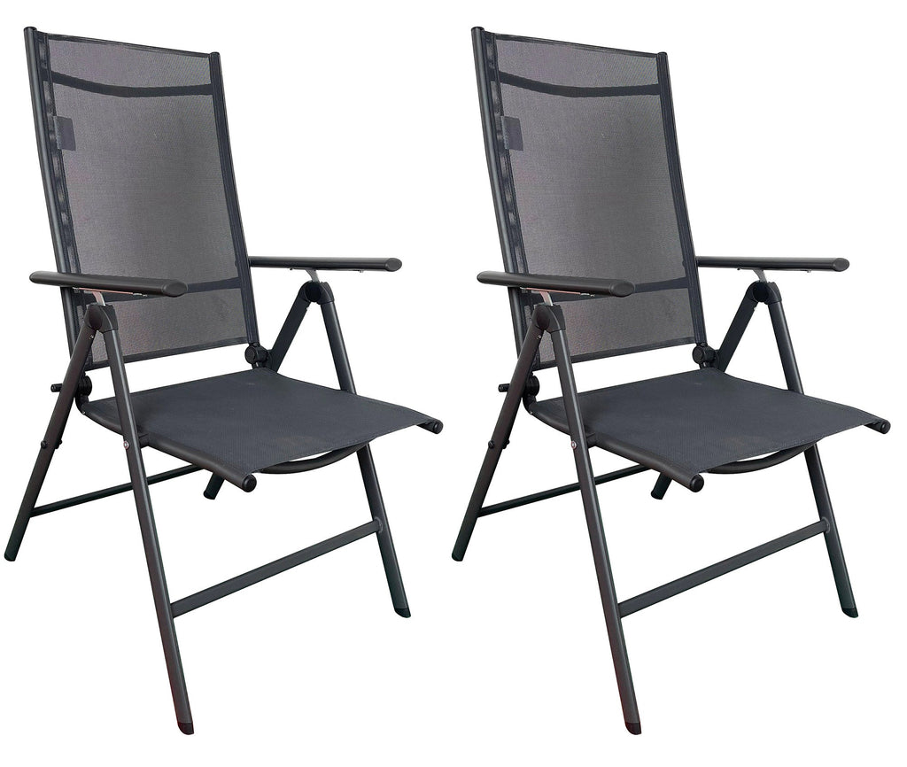 Set di 2 sedie pieghevoli in acciaio e textilene 1x1 con braccioli. Ideali per esterno, sono facilmente richiudibili e quindi salvaspazio.