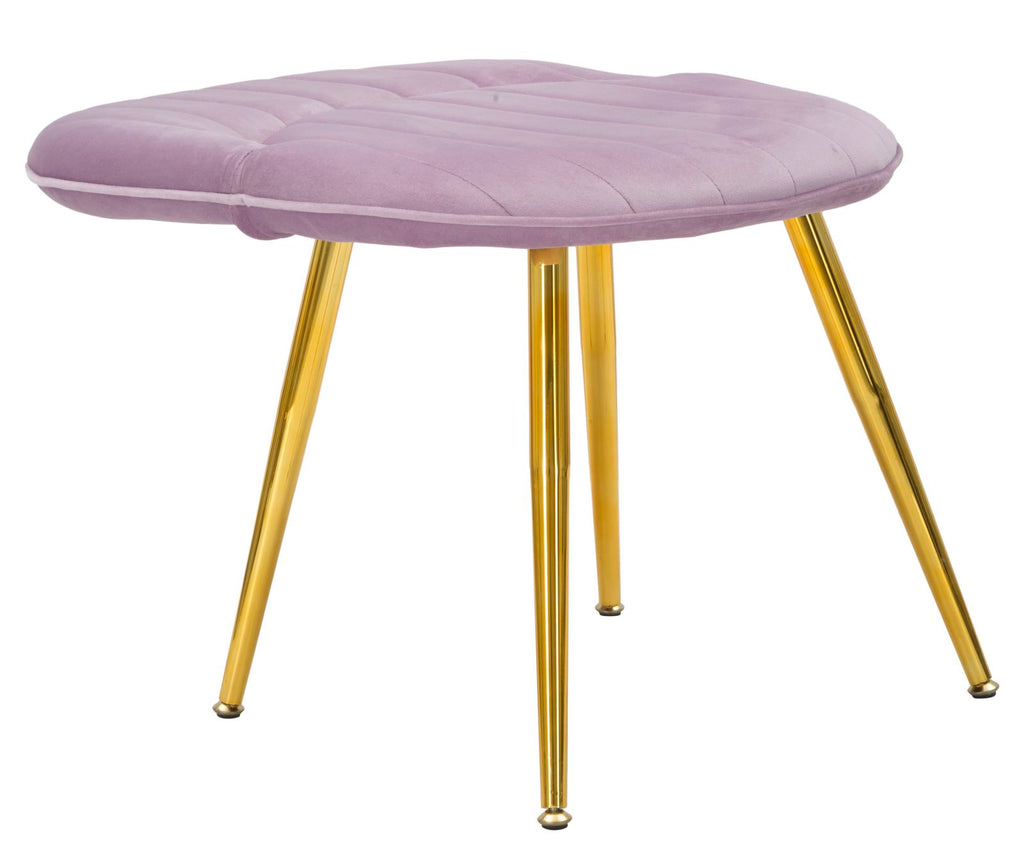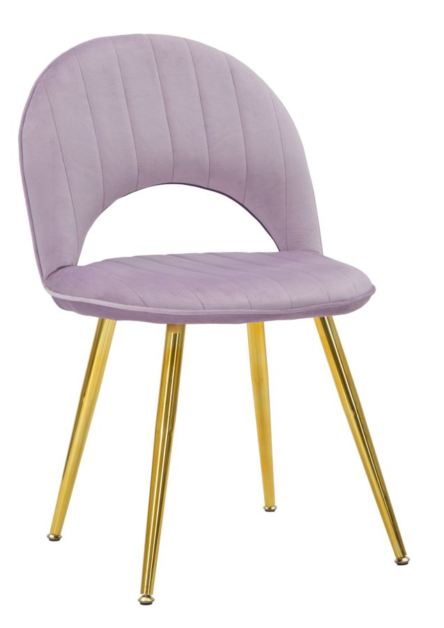 Chaise en velours rembourré rose avec pieds en métal doré. Le design particulier du dossier donne une touche d'élégance et de raffinement.