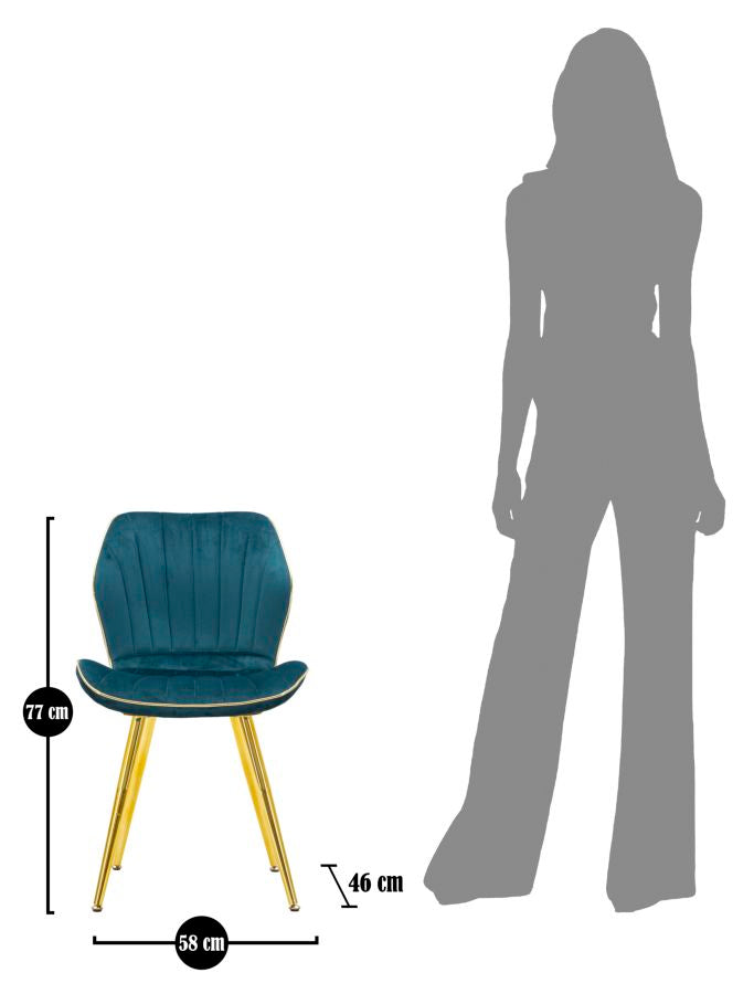 Queste sofisticate sedie imbottite sono rivestite in un lussuoso velluto sintetico color ottanio, garantendo un comfort eccezionale. Il loro comodo schienale offre un sostegno ottimale e le rifiniture dorate conferiscono un tocco luminoso ed elegante. Questa coppia di sedie rappresenta il perfetto equilibrio tra stile raffinato e praticità.