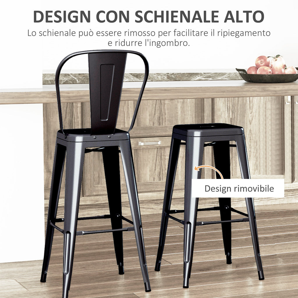 Set 2 Sgabelli da Bar Stile Industriale Schienale Rimovibile 44x49x116 cm in Metallo Nero