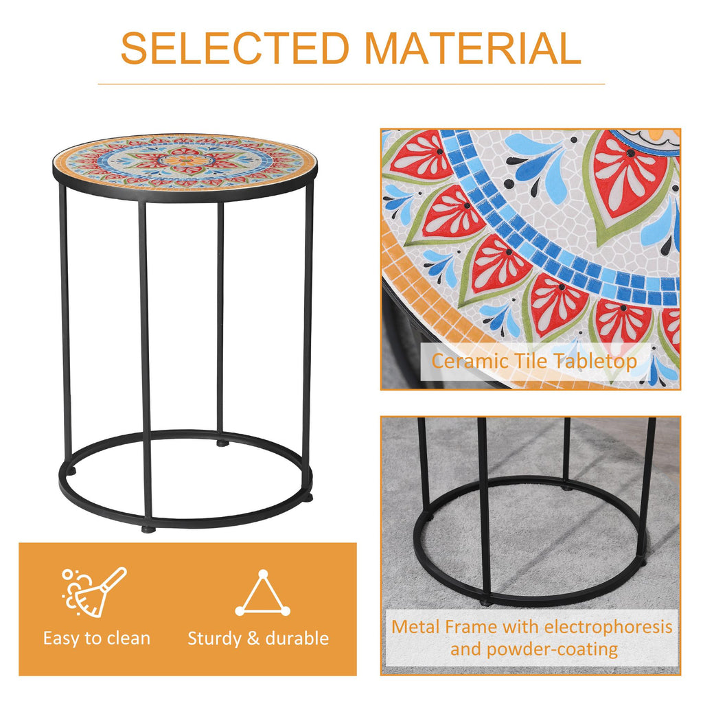 Pour un ajout unique à votre mobilier de jardin, choisissez ce magnifique ensemble de tables de jardin. Fabriquées avec une structure en métal robuste et durable recouverte de poudre par électrophorèse, les tables sont dotées d'un magnifique plateau en mosaïque de céramique résistant aux taches et facile à nettoyer. Tables de jardin parfaites pour se détendre ou déguster une glace entre amis et en famille lors d'une chaude après-midi d'été.