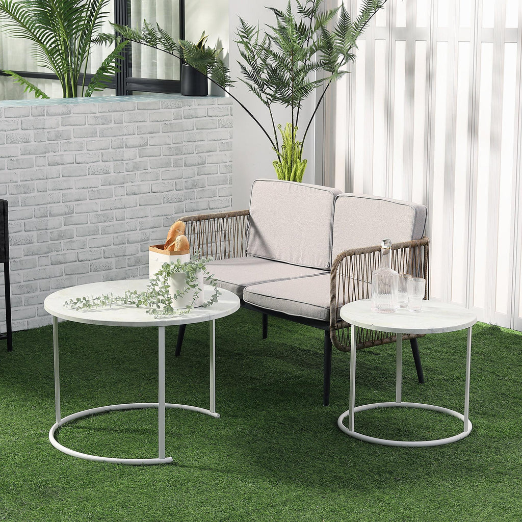 Ensemble de 2 tables basses de jardin avec plateau en métal effet marbre blanc
