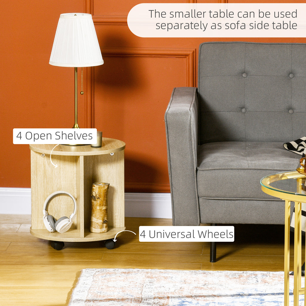 Lot de 2 tables basses rondes empilables en acier, verre et aggloméré doré et chêne