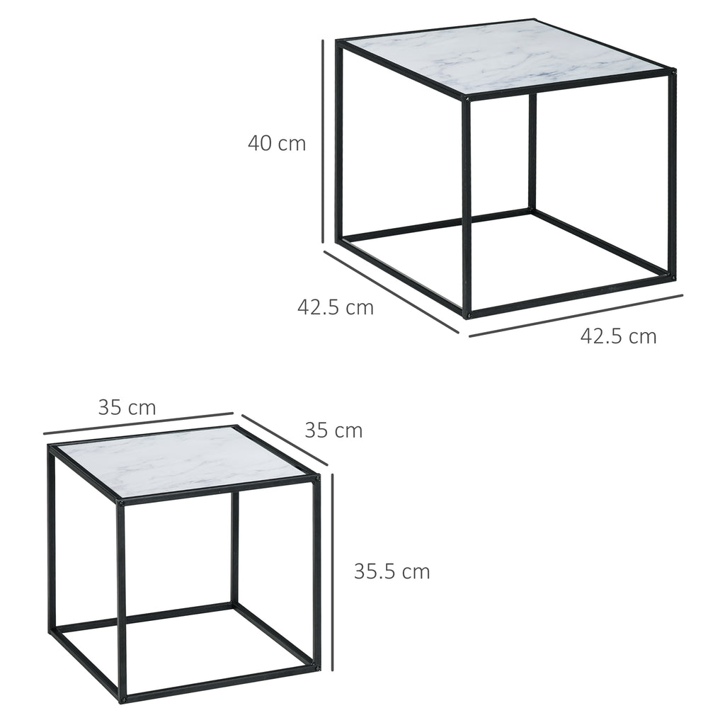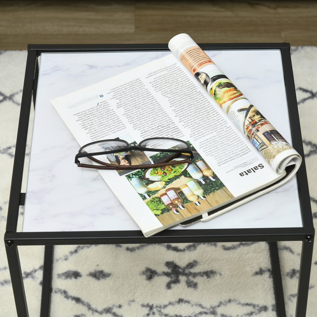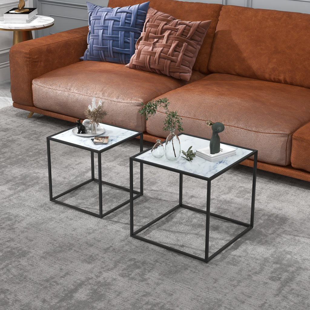 Set 2 Tavolini Quadrati Impilabili in Acciaio e Vetro Temperato Nero e Effetto Marmo