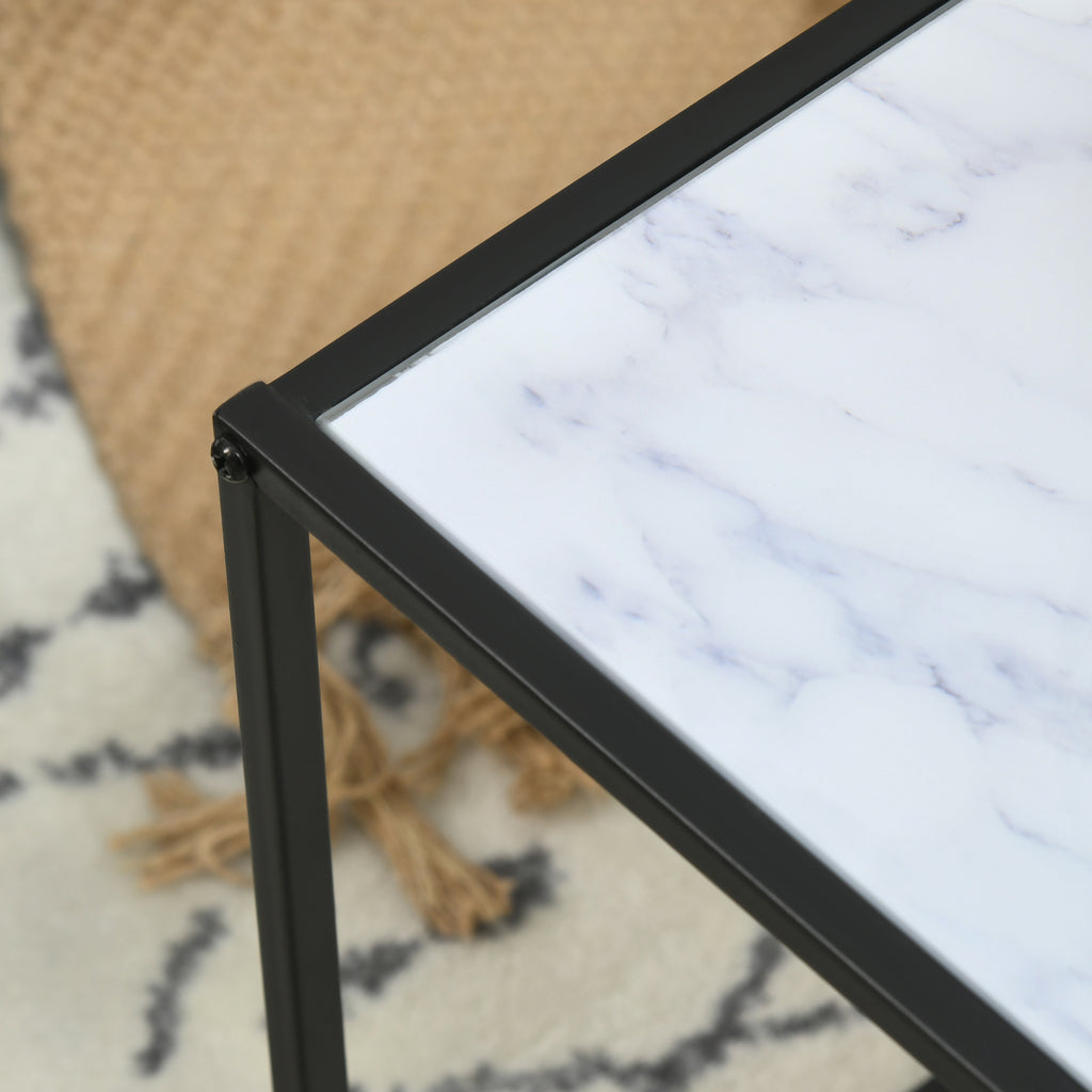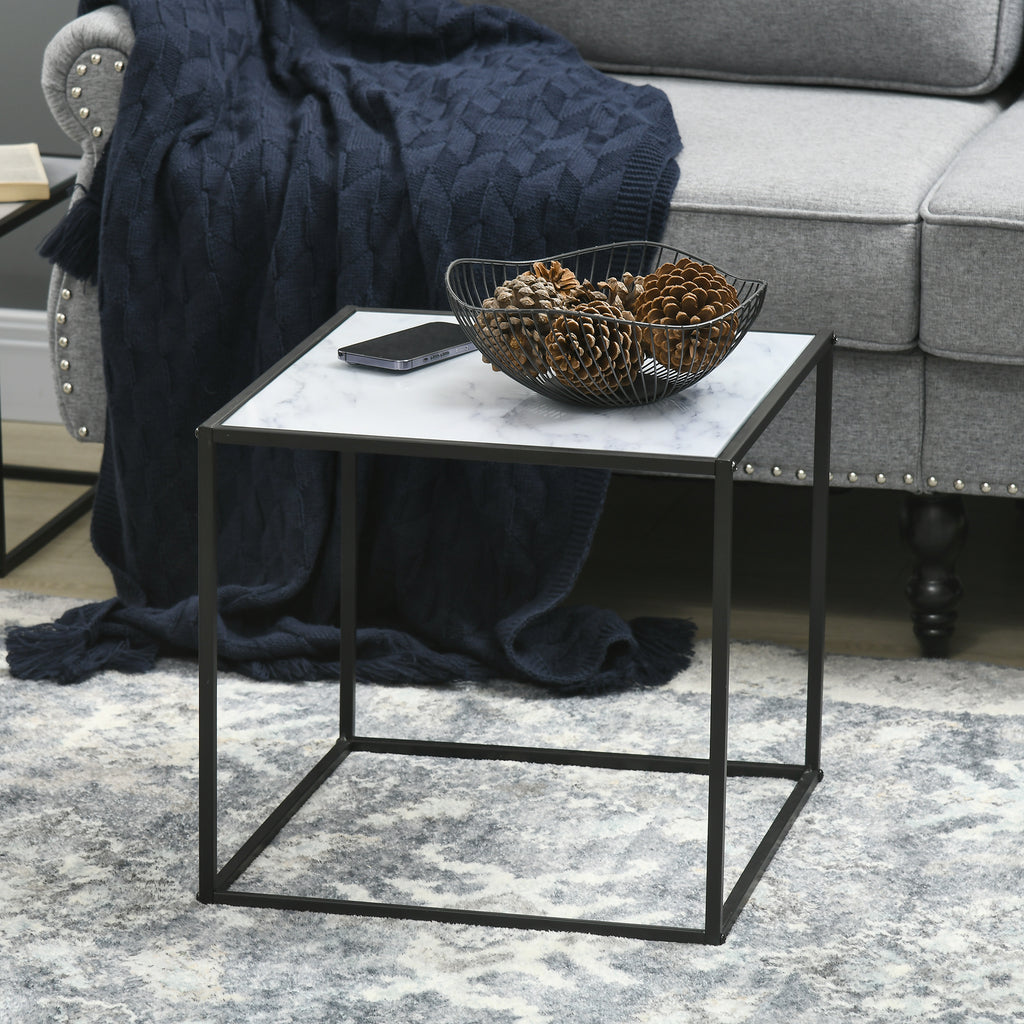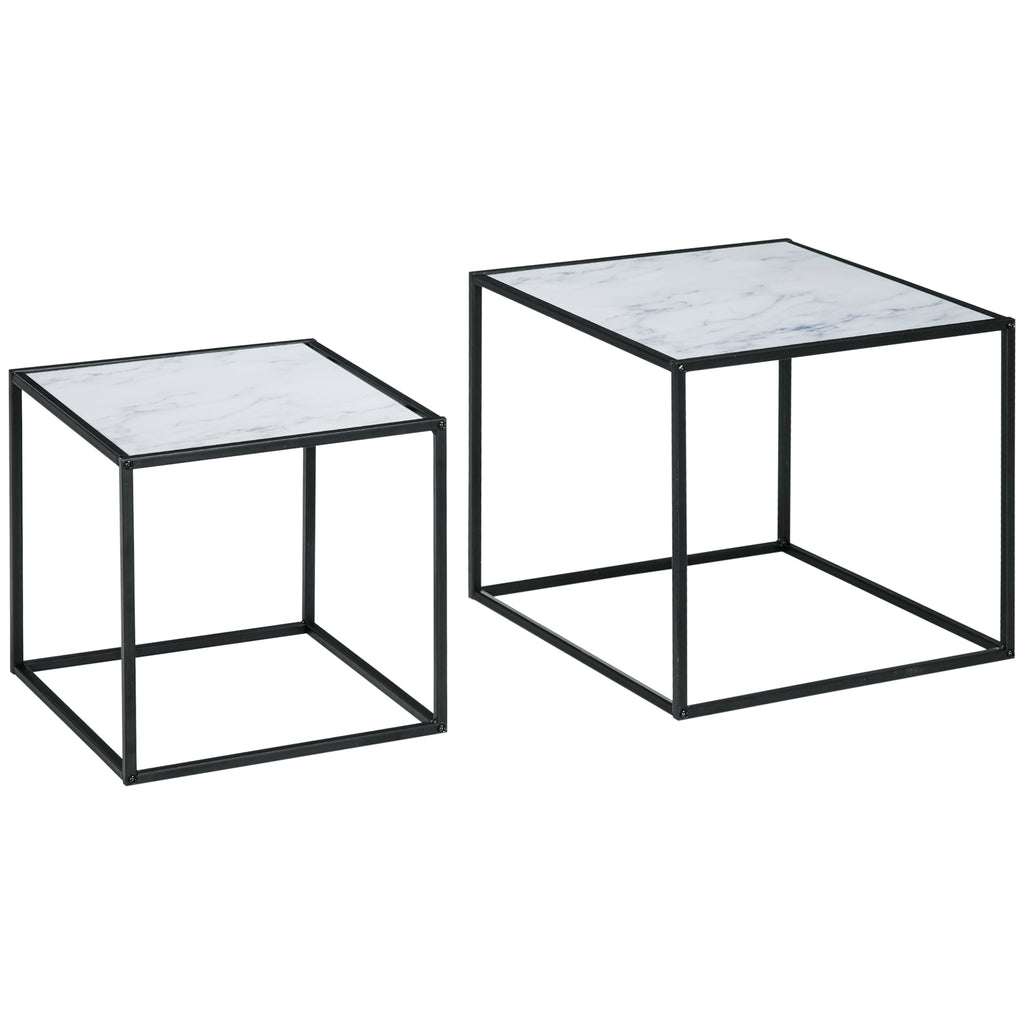 Set 2 Tavolini Quadrati Impilabili in Acciaio e Vetro Temperato Nero e Effetto Marmo