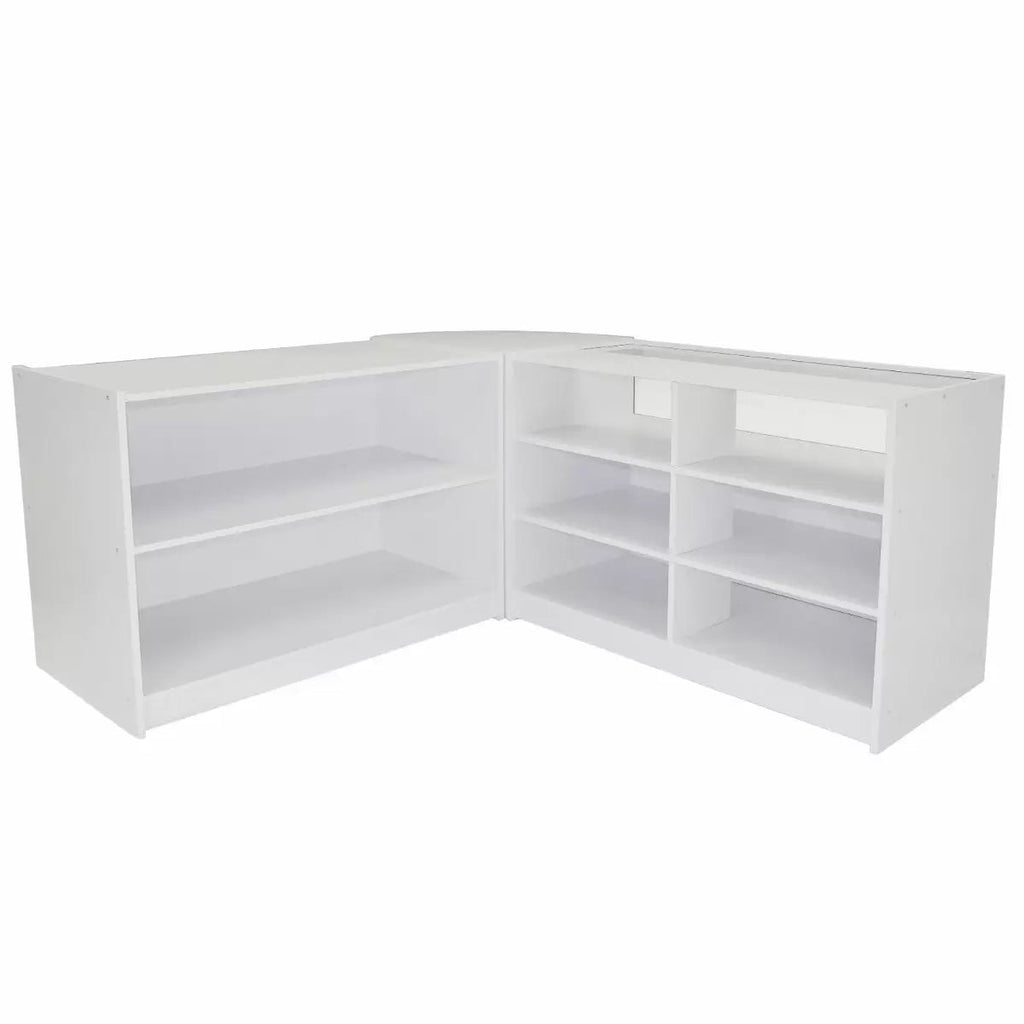 Ensemble de 3 comptoirs de magasin d'angle avec étagères et vitrine blanc brillant
