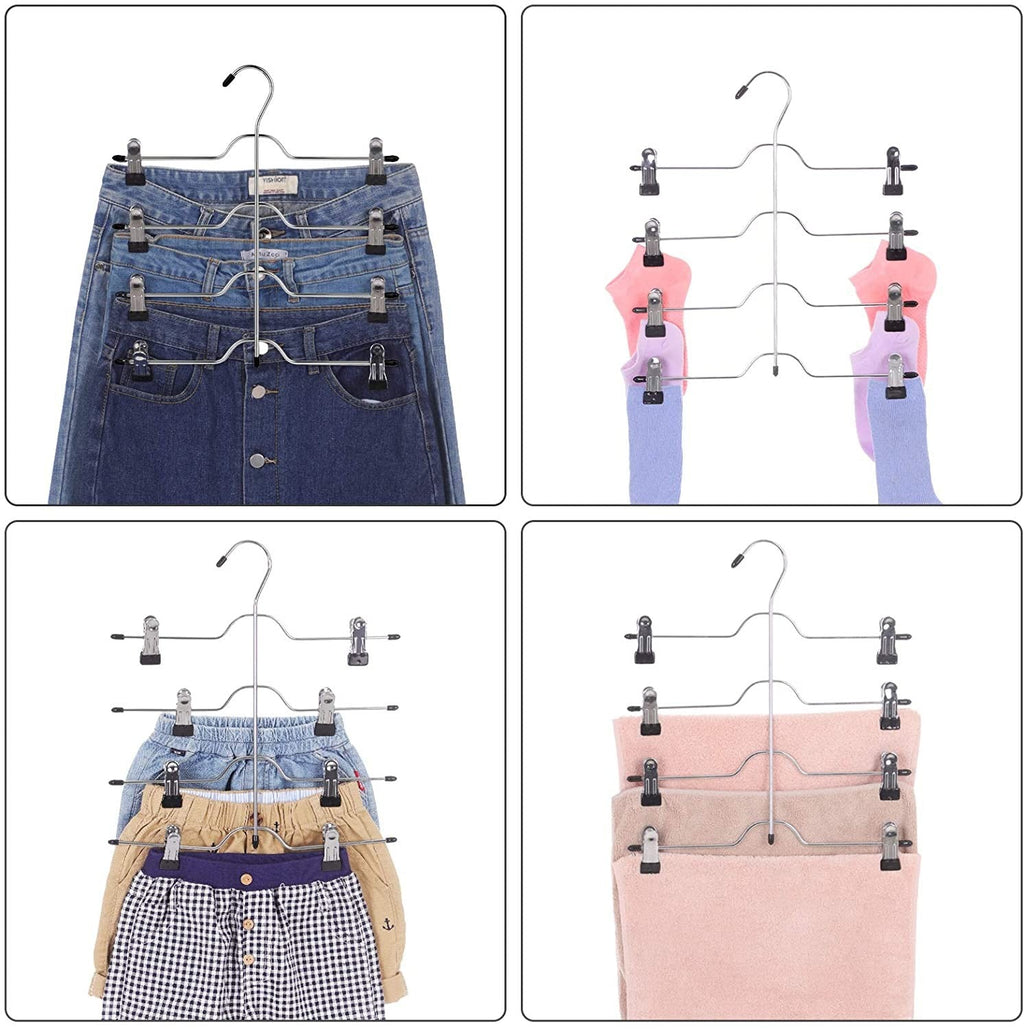 Si vous avez peu de place dans votre placard mais que vous ne voulez pas renoncer à tous vos vêtements, ces cintres sont faits pour vous : un seul cintre peut contenir jusqu'à 4 pantalons tout en occupant un minimum d'espace, rendant votre garde-robe beaucoup plus ordonnée et mieux organisée. Fabriqué en métal, il est équipé de clips antidérapants qui peuvent être adaptés à différentes épaisseurs, en effet il peut facilement supporter manteaux, pulls, couvertures et serviettes grâce aux patins en caoutchouc antidérapants qui permettent une prise solide.