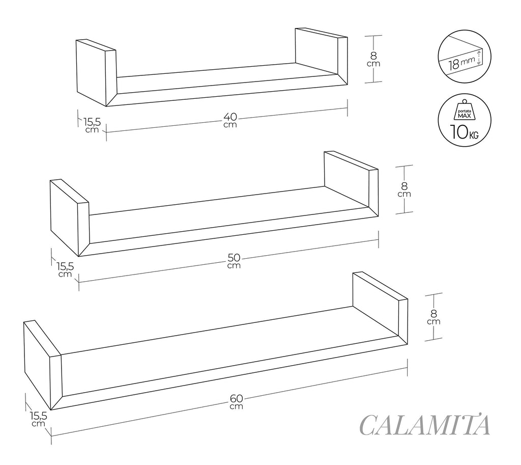 - Dimensioni mensola piccola (LxPxA): 40 x 15,5 x 8 cm