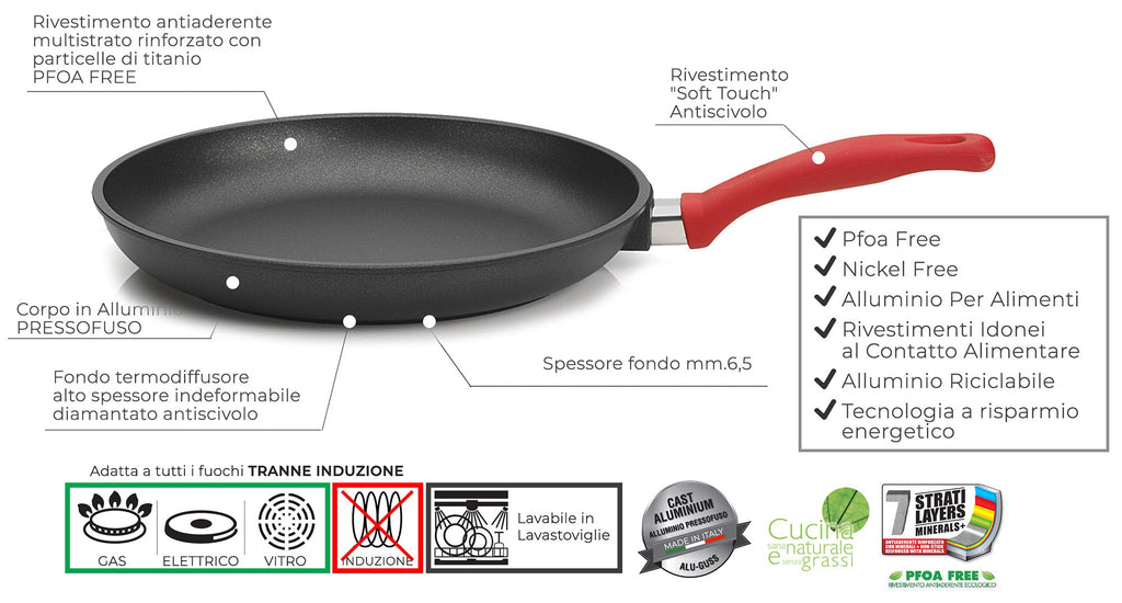 La haute qualité du revêtement antiadhésif multicouche renforcé de titane garantit une meilleure anti-adhérence et une haute résistance à l'abrasion. Lors de la cuisson avec la ligne Rouge , il n'est pas nécessaire d'utiliser des graisses, obtenant ainsi une cuisine saine, diététique et naturelle .
