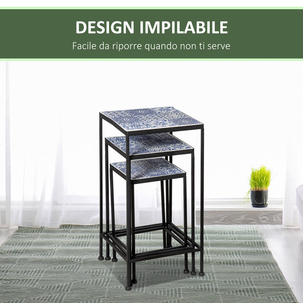 Lot de 3 porte-plantes avec surface en carreaux de céramique pour jardin et balcon en métal bleu et noir
