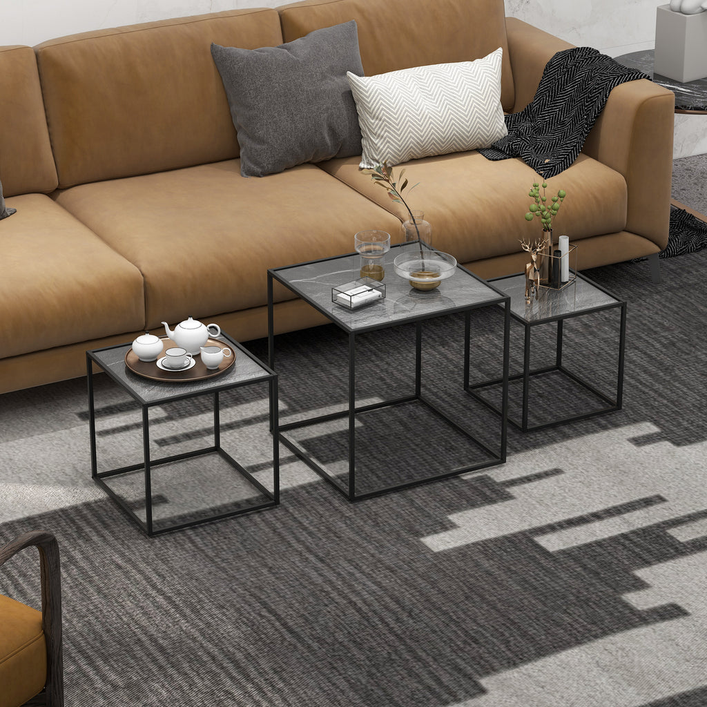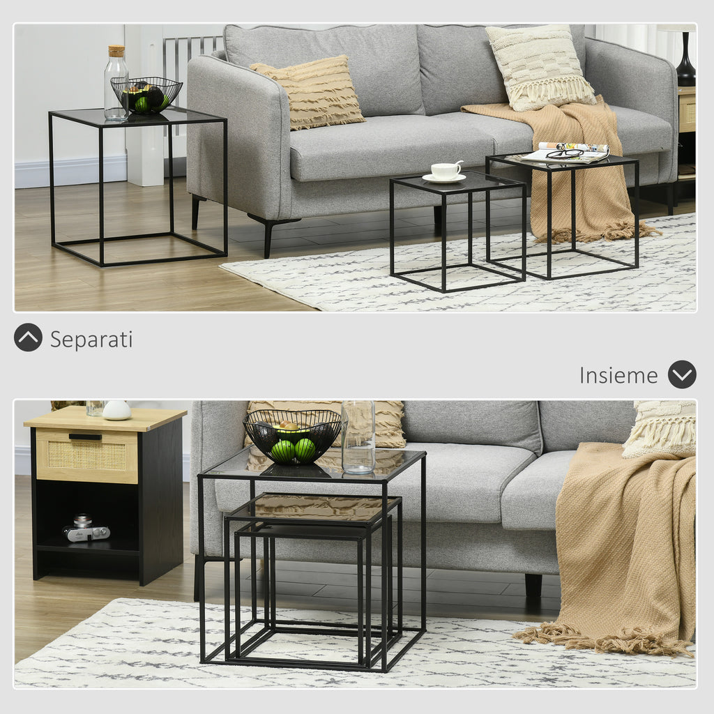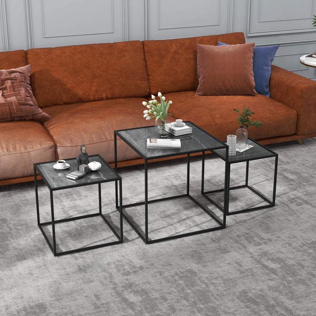 Set 3 Tavolini Quadrati Impilabili in Acciaio e Vetro Temperato Nero e Effetto Marmo