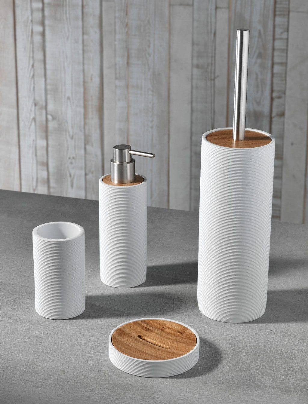 Set de 4 Accessoires de Salle de Bain en TFT Accessories Blanc Rayé et Résine de Bambou