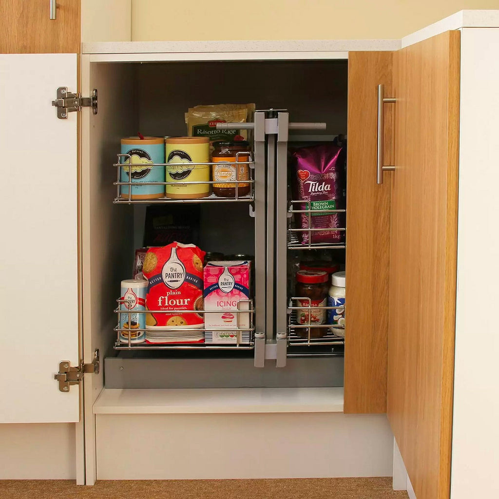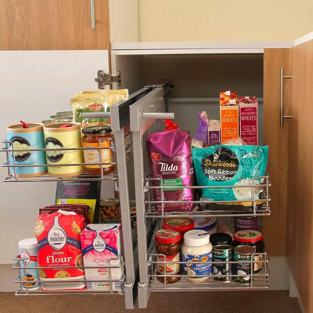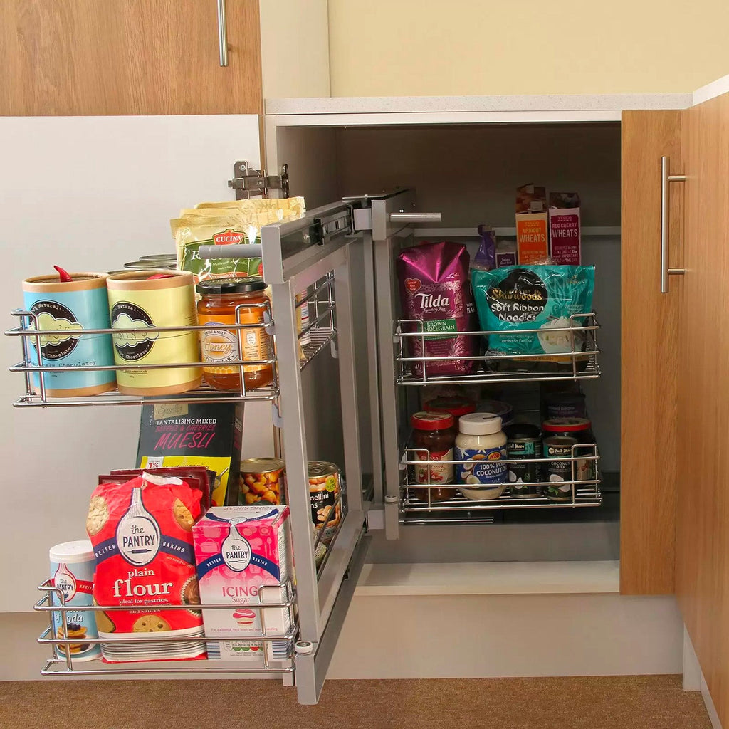 Si vous possédez une armoire de cuisine avec un coin aveugle, maximisez l'espace avec cet ensemble de paniers coulissants en métal.