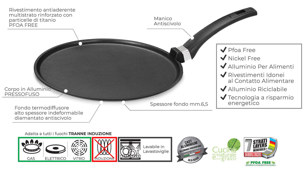 Produits en aluminium moulé sous pression de haute qualité avec revêtement multicouche renforcé, articles destinés à une cuisine spéciale qui, grâce à leurs formes particulières, valorisent et facilitent la préparation de nombreuses recettes, tant italiennes que d'autres cultures.