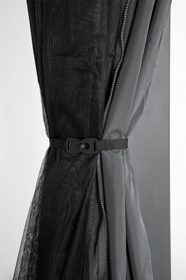 - Chaque toile et moustiquaire comprend des fermetures éclair pour assurer la fermeture totale du périmètre de la pergola.