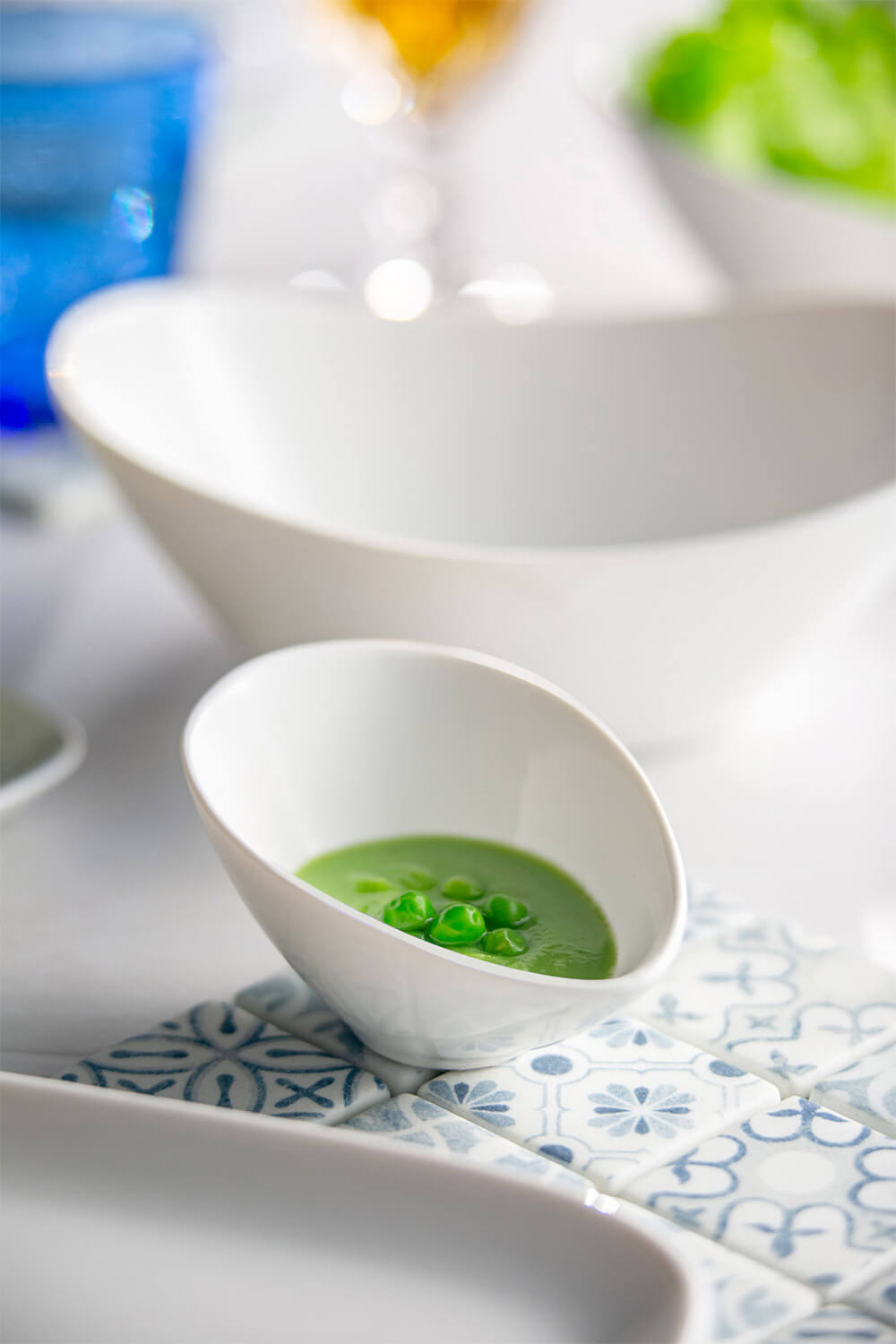 - Formes : tasses obliques avec une forme ovale moderne et une élégance minimale qui rend la table raffinée et actuelle. Particulièrement adaptés pour contenir des Fingers ou des sauces, ils sont conçus pour s'accorder parfaitement aux plateaux/assiettes (notamment les trapèzes) de la même collection.
