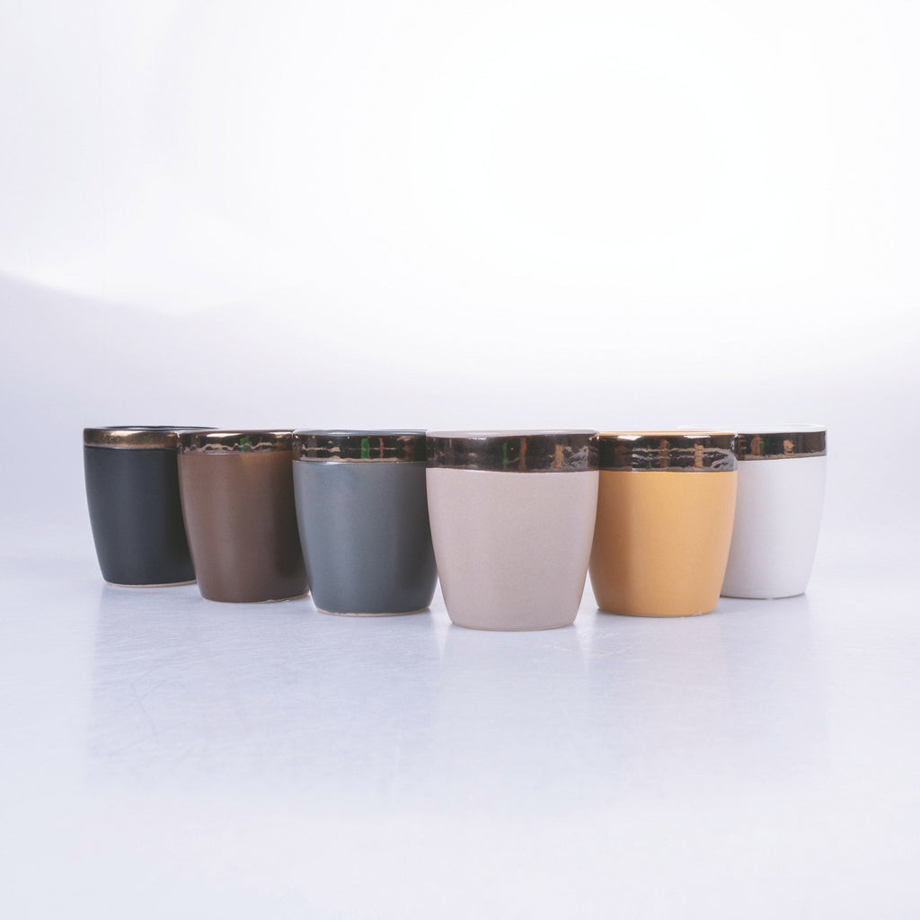 Verres Naima : rencontre des matériaux Les verres Naima créent la combinaison parfaite de matériaux entre deux finitions différentes en grès. Un effet plein et opaque, qui évoque les textures de l'argile crue, se ferme dans une bordure en cuivre, créant une combinaison élégante et suggestive.