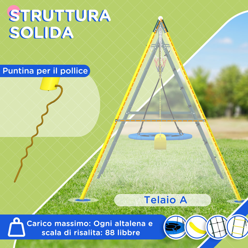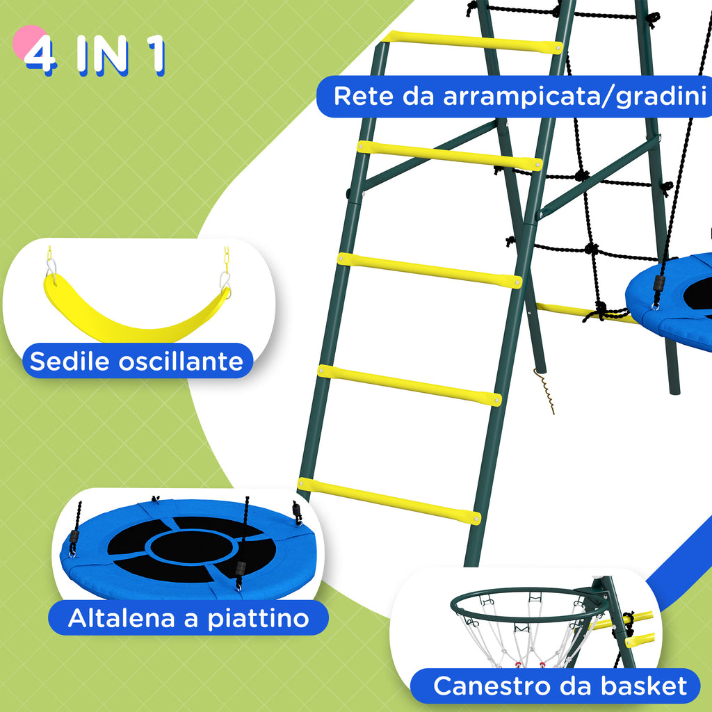 - MULTIFUNZIONE: Questo set di giochi per bambini da esterno offre 4 diverse modalità di divertimento. La struttura è dotata di altalena rotonda Ø100 cm, un'altalena classica, una parete di arrampicata in corda, una scaletta e un canestro. La struttura perfetta per far giocare fino a 4 bambini contemporaneamente, grazie alla sua capacità di peso fino a 160 kg