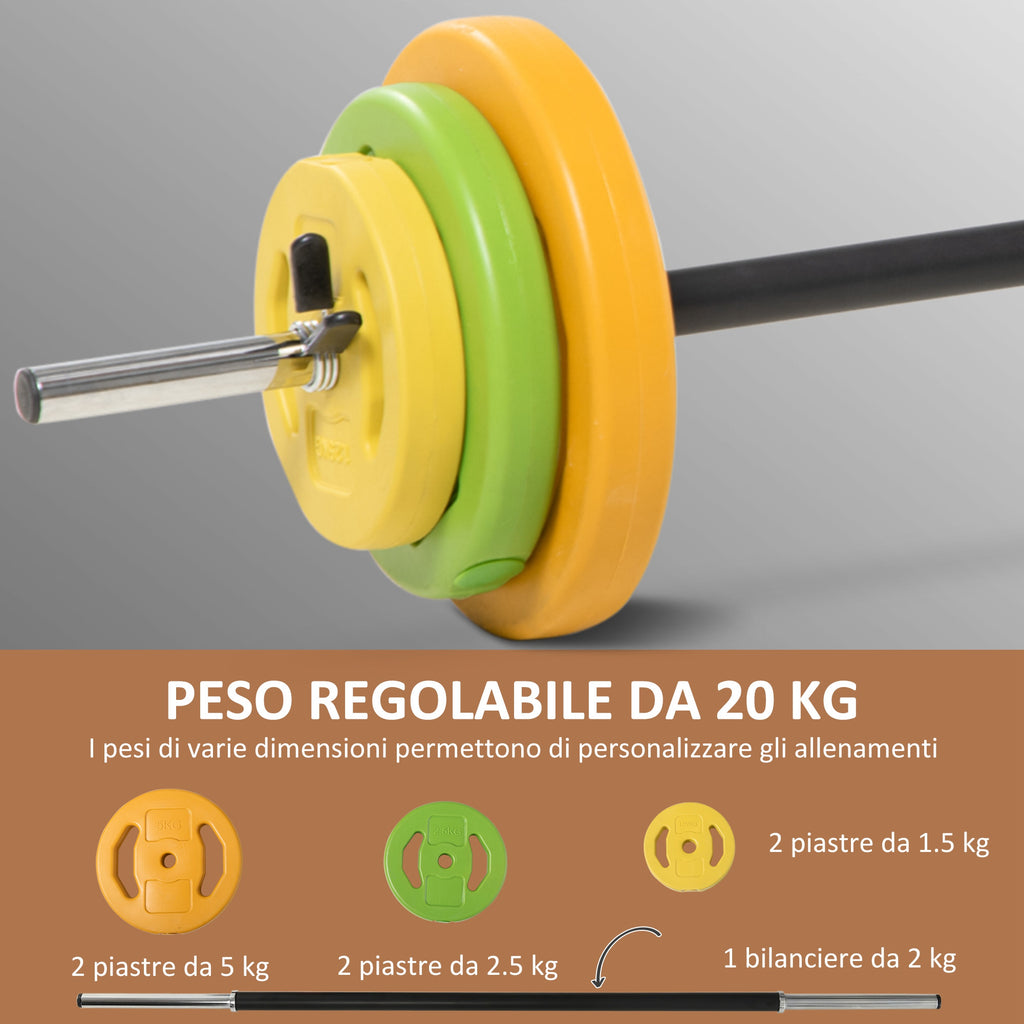 Set Bilanciere e Dischi da 20Kg Totali 6 Pesi 2 Clip di Fissaggio e Presa Antiscivolo in Metallo e PU Multicolore