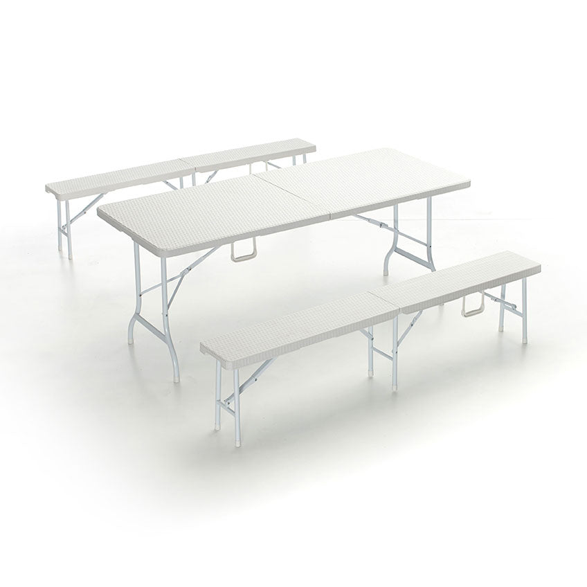 Ensemble de bière de jardin pliant en table en rotin et 2 bancs blancs Taddei Plastik 180