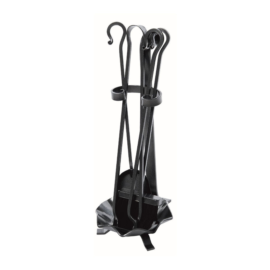 Trespolo forgiato a mano con bacinella, H cm 52, realizzato in ferro, costituito da 4 elementi (paletta, scopino in PVC, attizzino, pinza), verniciato colore nero opaco, Made in Italy, facile da pulire con un panno umido, montaggio non richiesto