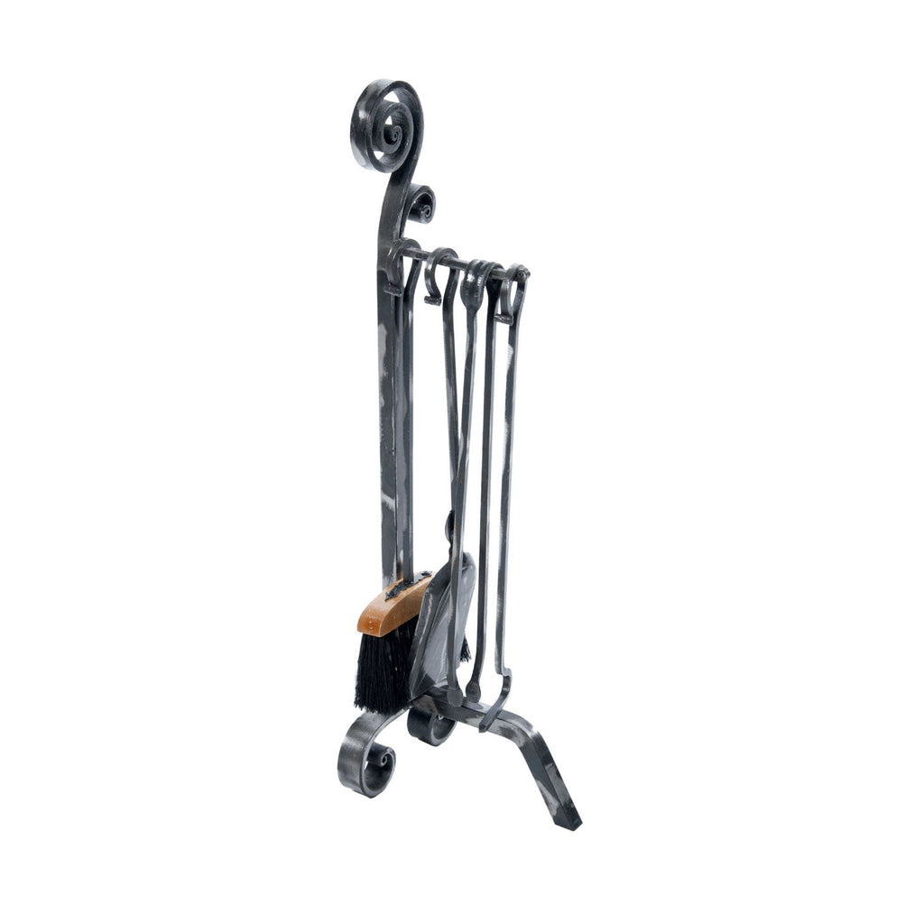 Trespolo forgiato a mano con spirale superiore, H cm 70, realizzato in ferro quadro mm 20, costituito da 4 elementi (paletta, scopino in tampico, attizzino, pinza), con molatura e verniciatura trasparente, Made in Italy, facile da pulire con un panno umido, montaggio non richiesto