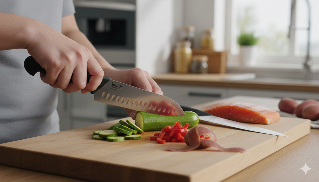 Le couteau Buffalo Santoku est parfait pour hacher et couper en dés, pour couper des légumes et pour préparer des plats de viande et de poisson.