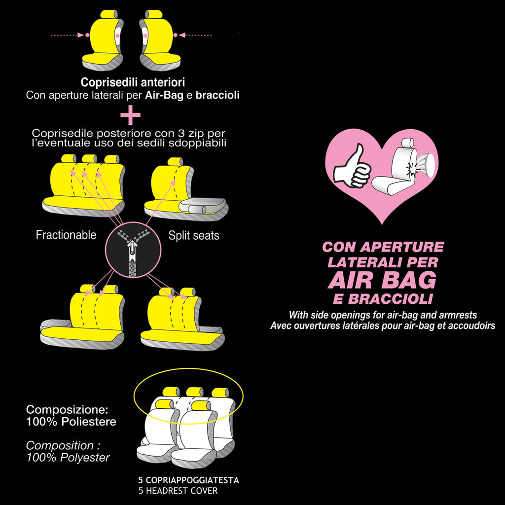 - La housse de siège avant convient également aux voitures équipées d'airbags latéraux (elle n'affecte pas leur bon fonctionnement)