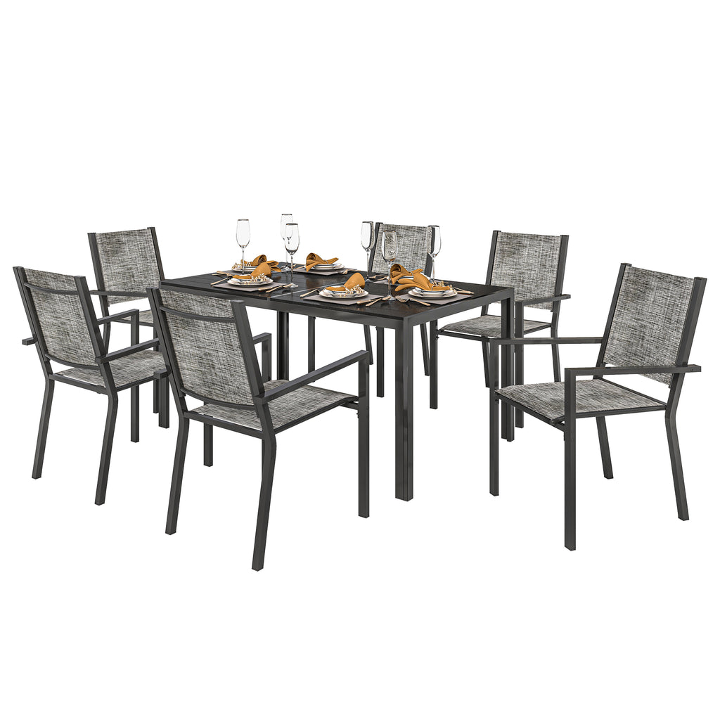 Set da Giardino 7 Pezzi con Tavolo Rettangolare e 6 Sedie Impilabili Traspiranti in Acciaio Grigio e Nero