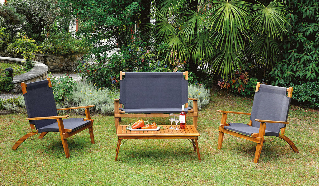 Ensemble de jardin canapé 2 fauteuils et table basse en bois Vorghini Valladolid