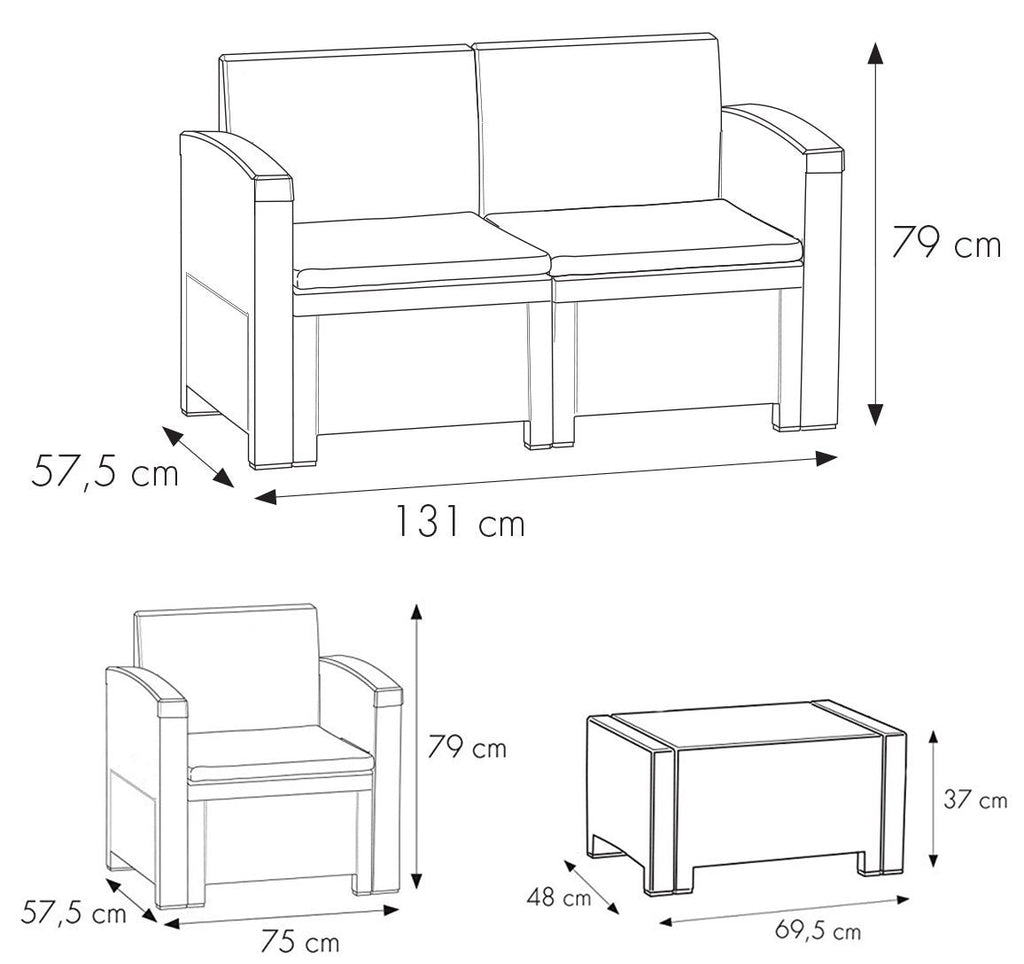 Caractéristiques techniques >Ensemble de jardin en polypropylène Vandi Nebraska canapé 2 fauteuils et table basse
