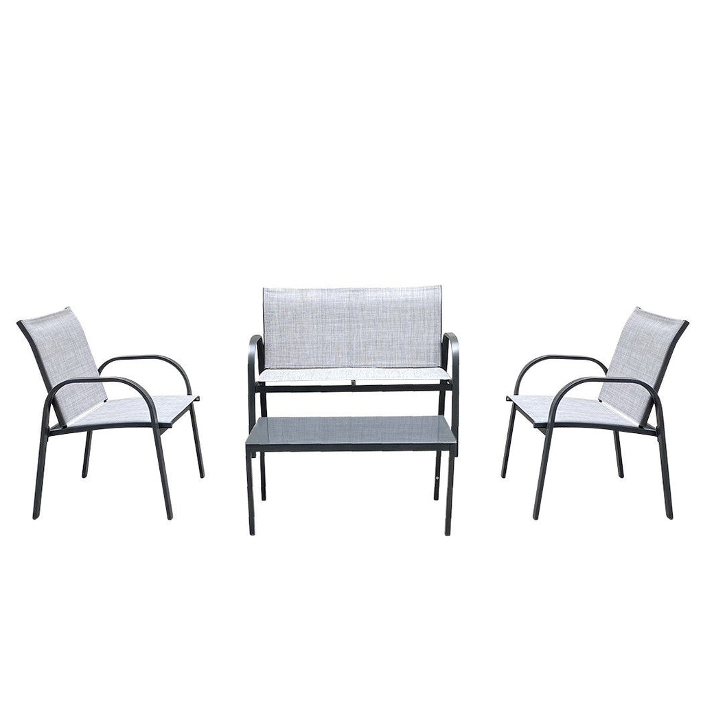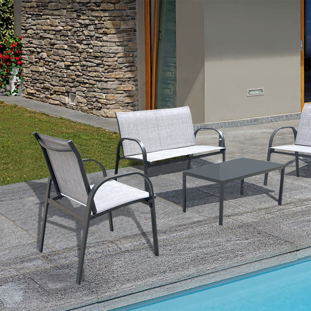 Salon de jardin canapé fauteuils et table basse en acier peint et textilène