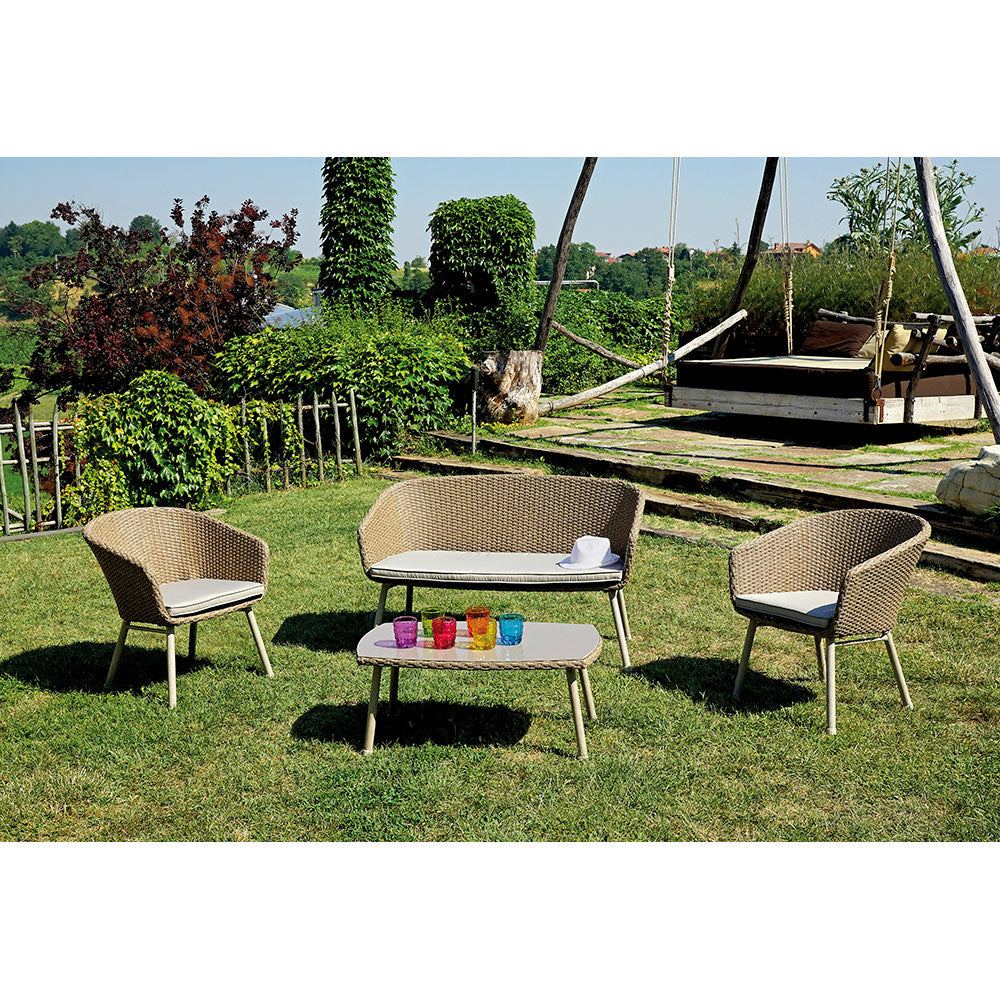 Ensemble Salon de Jardin 1 Table Basse 1 Canapé 2 Fauteuils en Osier et Aluminium Vorghini Malaga Gris avec Coussins