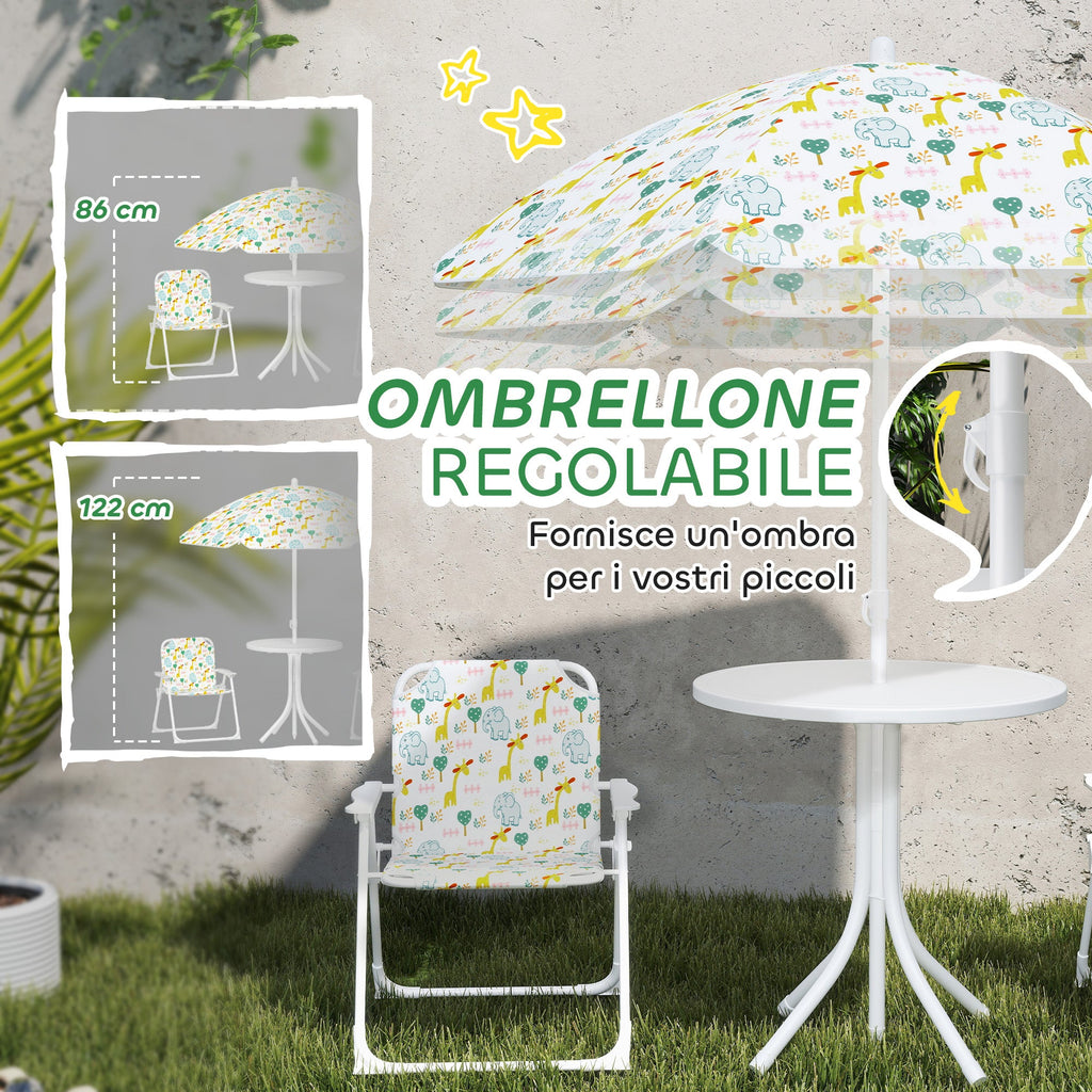 - SET DIVERTENTE PER GIARDINO: Questo allegro set da esterno comprende due sedie pieghevoli per bambini, un tavolo rotondo e un ombrellone regolabile in altezza con fantasia a giraffe ed elefanti, ideale per far rilassare e divertire all'aperto i tuoi piccoli