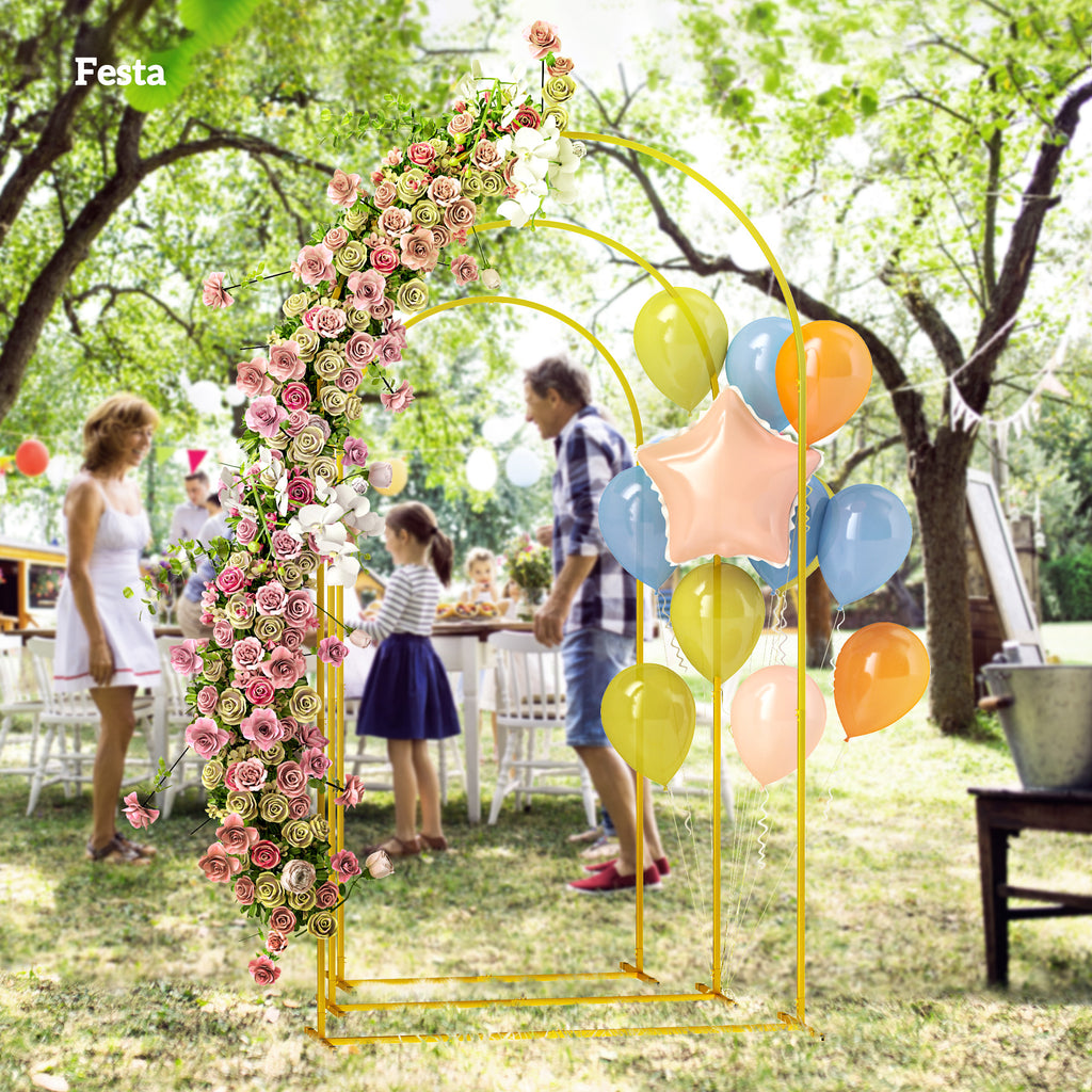 Trasforma il tuo giardino in un incantevole mondo fatato con gli archi per rampicanti! Realizzati in metallo robusto con finitura dorata, questi archi da giardino aggiungono eleganza e charme a ogni ambiente, sia esterno che interno. Decorali con fiori e palloncini per creare il perfetto scenario per matrimoni, feste o shooting fotografici. Libera la tua creatività e crea momenti indimenticabili.