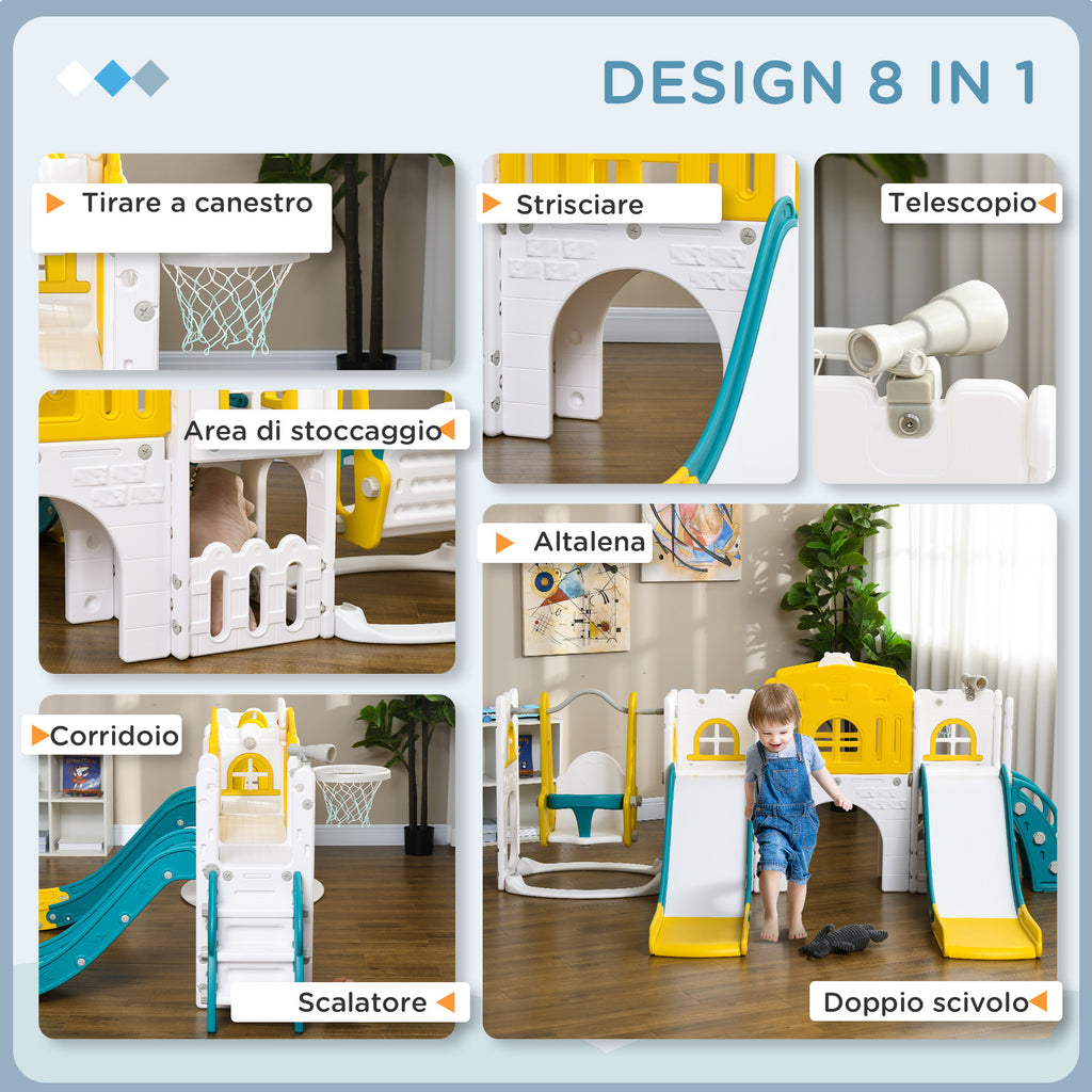 Set Gioco 8 in 1 per Bambini 2 Scivoli Altalena Canestro Tunnel Giallo
