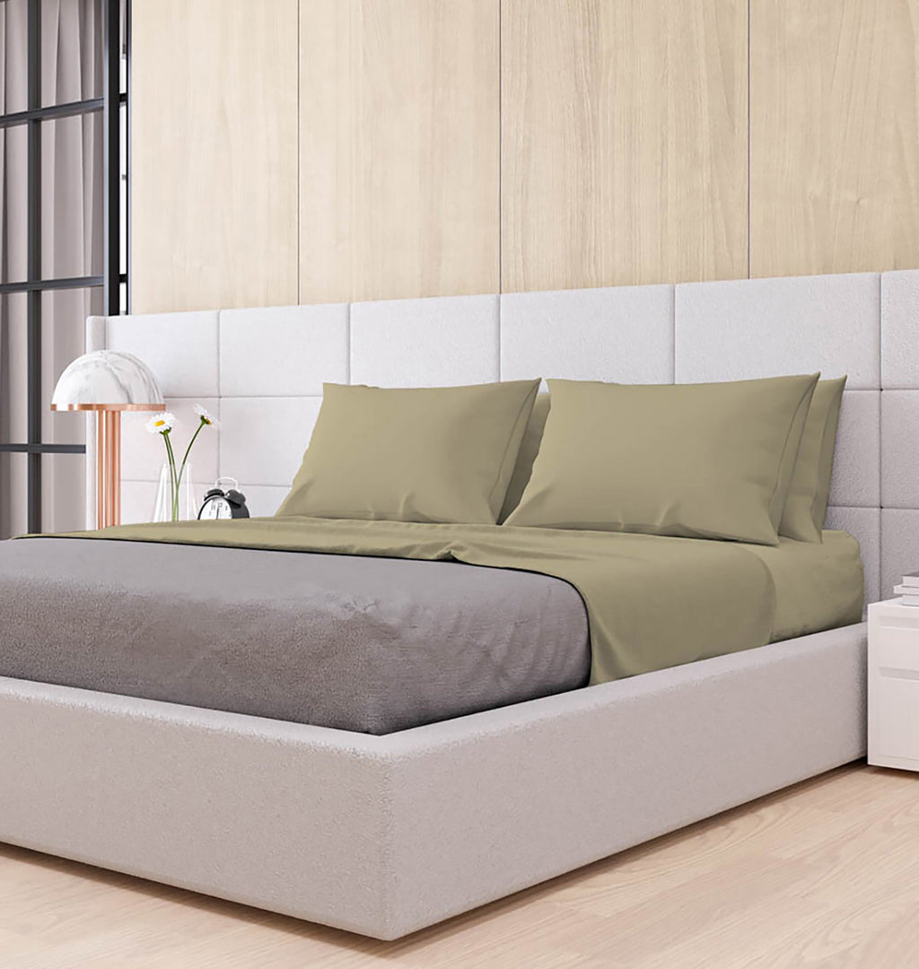 Parure de lit unie composée d'un drap de dessus, d'un drap de dessous et de taies d'oreiller. Fabriqué en coton fin, avec une attention particulière aux finitions et un processus de "finition" qui donne une brillance particulière aux couleurs et une haute résistance au lavage.