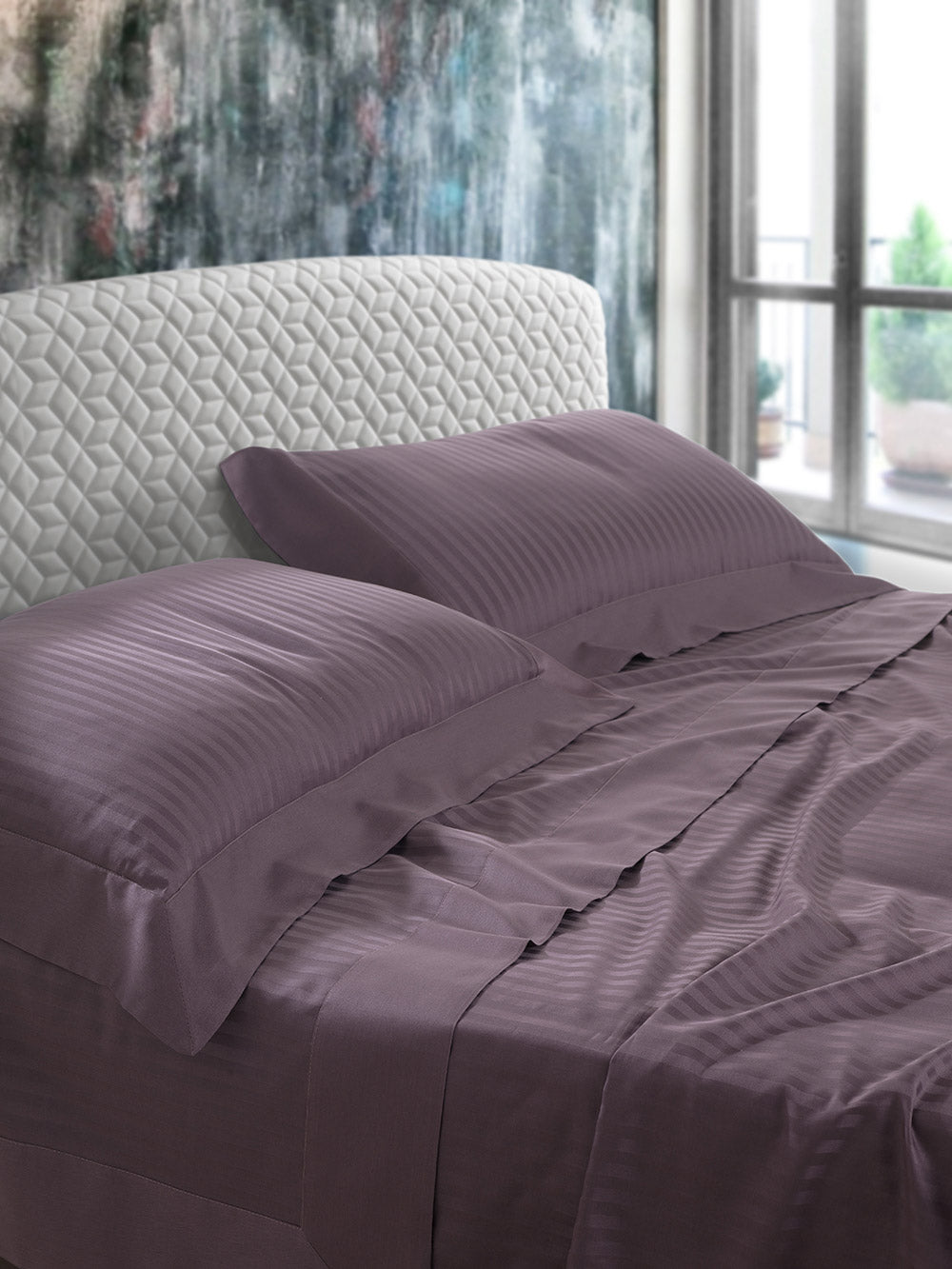 Parure de lit en pur satin de coton rayé, 300 fils . L'ensemble se compose d'un drap de dessus, d'un drap de dessous avec coins et de 2 taies d'oreiller d'une couleur élégante qui rehausse l'éclat du plus fin pur coton rayé .